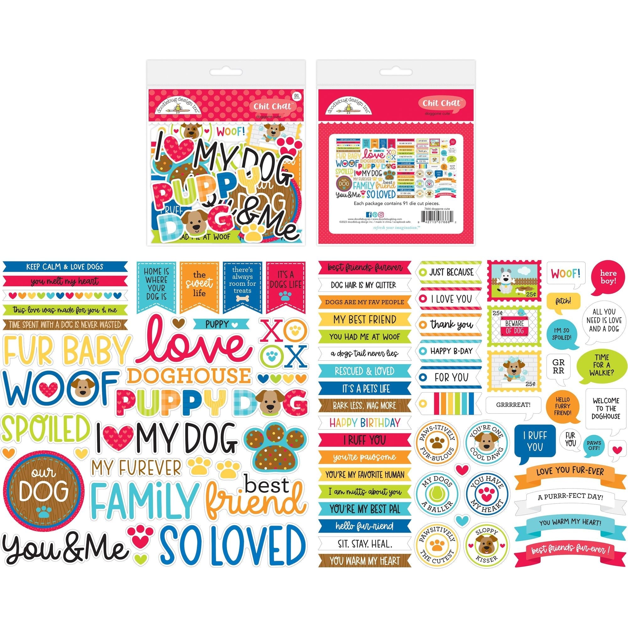 The set includes a variety of designs, such as speech bubbles, paw prints, and phrases like "woof", "fur baby", "best friend", "my furever family" and "good dog". The shapes come in different sizes, making them perfect for adding decorative elements and captions to scrapbook pages, cards, journals, planners, and other creative projects. Contains 91 unique die cut pieces in approximately 6x6 inch packaging. Chit Chat die cut shapes contain mostly sentiments to complement the icon imagery in Doggone Cute Odds and Ends ephemera die cut shapes.
