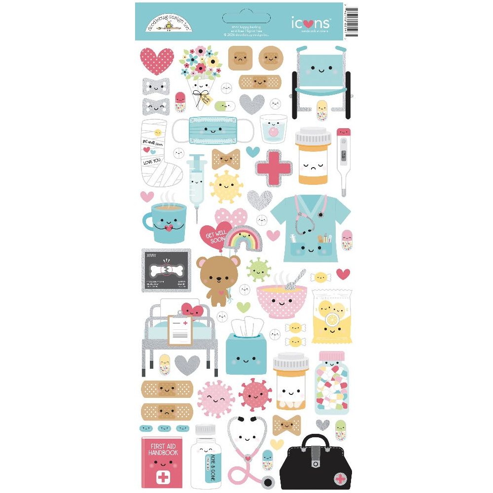 Add a touch of humor to your Get Well and Encouragement cards with Doodlebug's Happy Healing Icons Stickers! This 6x13 inch sheet is packed with playful icons, including band-aids, pills, and a get well bear. With a sprinkle of silver foil accents, these stickers are sure to bring a smile to anyone's face.