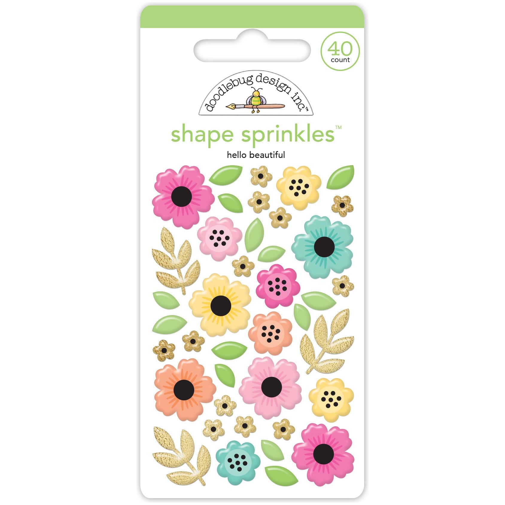 Experience unique design possibilities with Doodlebug Hello Beautiful Shape Sprinkles! This set of 40 assorted enamel stickers feature gold frond, gold small flowers, greenery, leaves, light pink flowers, dark pink flowers, yellow flowers, coral flowers, and blue flowers, giving you plenty of creative options. Use these stickers to add a burst of colorful accents to your scrapbooking and crafting projects! Contains 40 enamel stickers on an approximately 3.75 x 2.5 inch sheet.