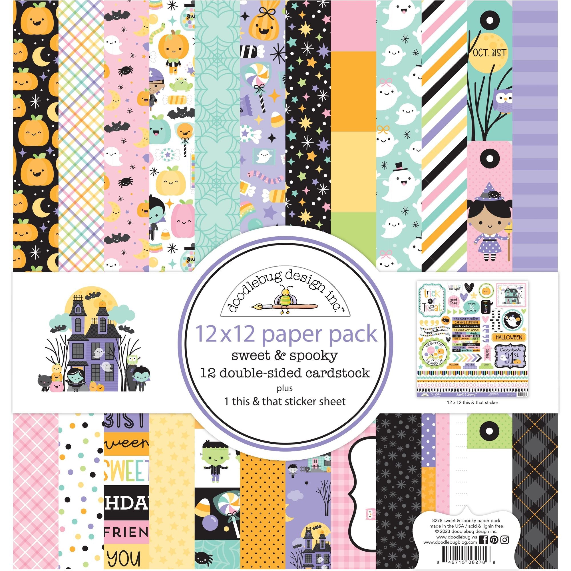 The Doodlebug Sweet and Spooky 12x12 Inch Paper Pack has everything you need to create spooky seasonal projects. It includes twelve 12x12 inch double-sided sheets of cardstock plus a 12x12 inch sticker sheet featuring jack o lanterns, bats, moons, ghosts, spider webs, and other Halloween-themed images. Create custom cards, decorations, and scrapbooks with this quality paper pack.