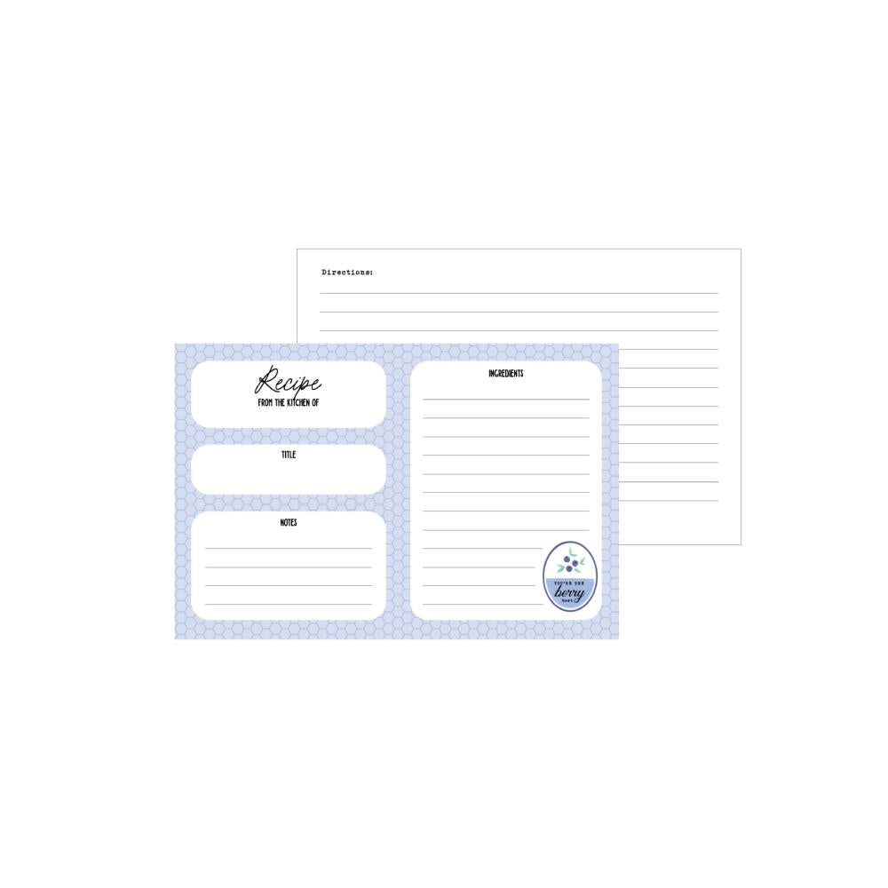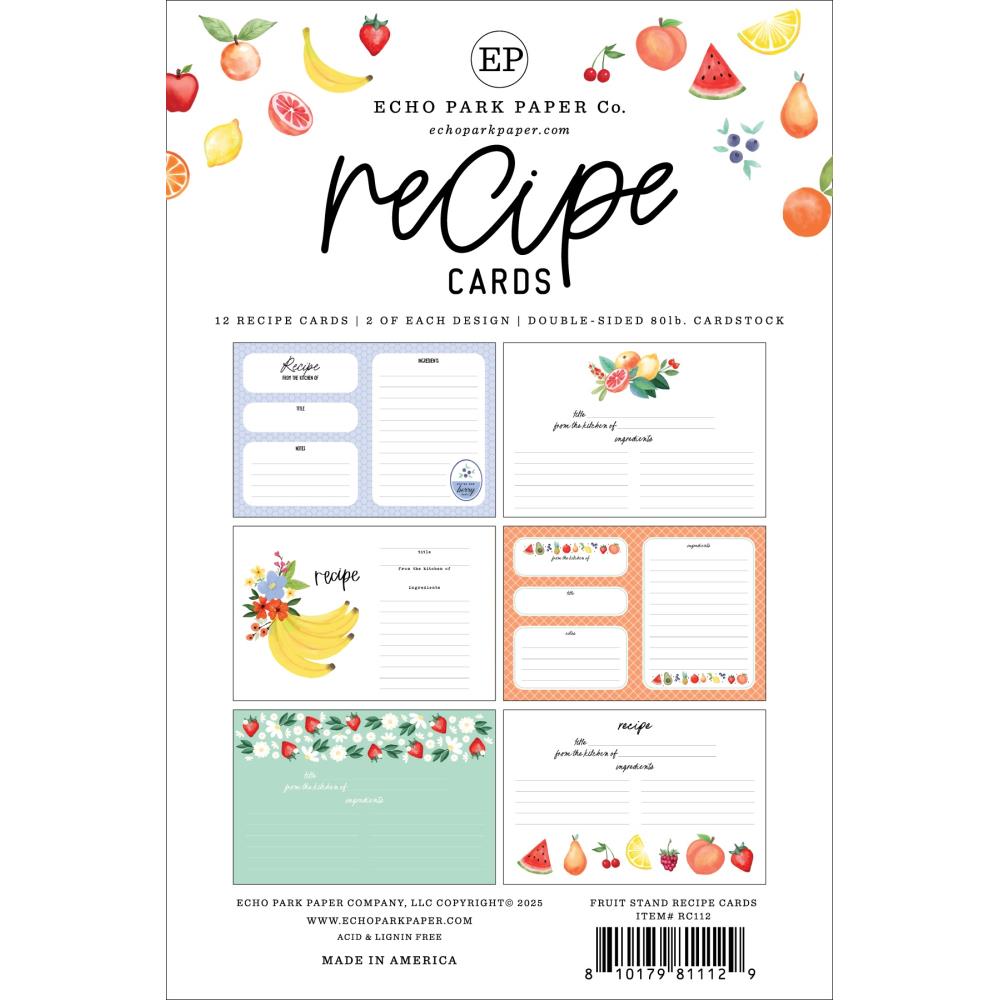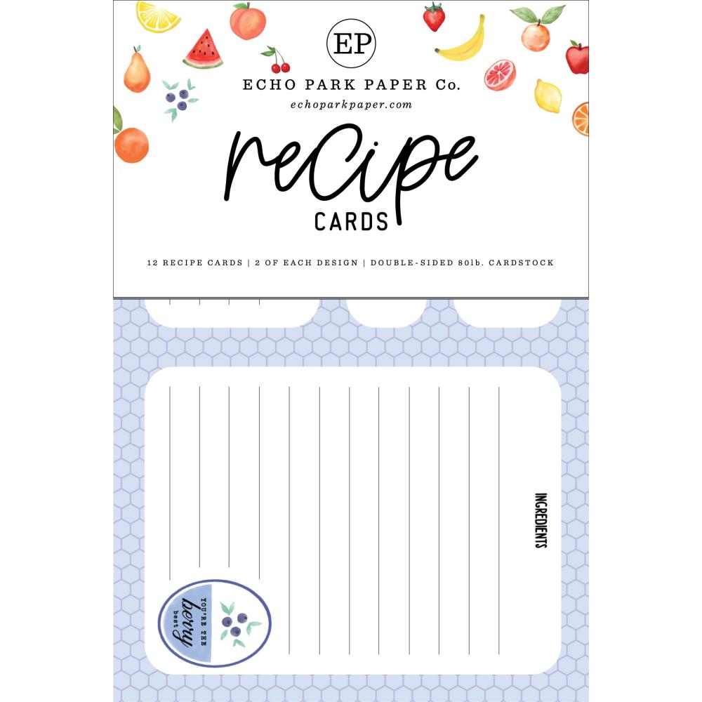 Record your favorite recipes on these charming 4 x 6 inch recipe cards. The set contains 12 double-sided cards, with two copies of each design, printed on sturdy 80lb. cardstock. Each card features designated spaces for Title, From the Kitchen Of, Ingredients, and Directions, complemented by delightful fruit and floral illustrations including bananas, peaches, strawberries, watermelons, grapefruit, cherries, lemons, pears, blueberries, and apples.