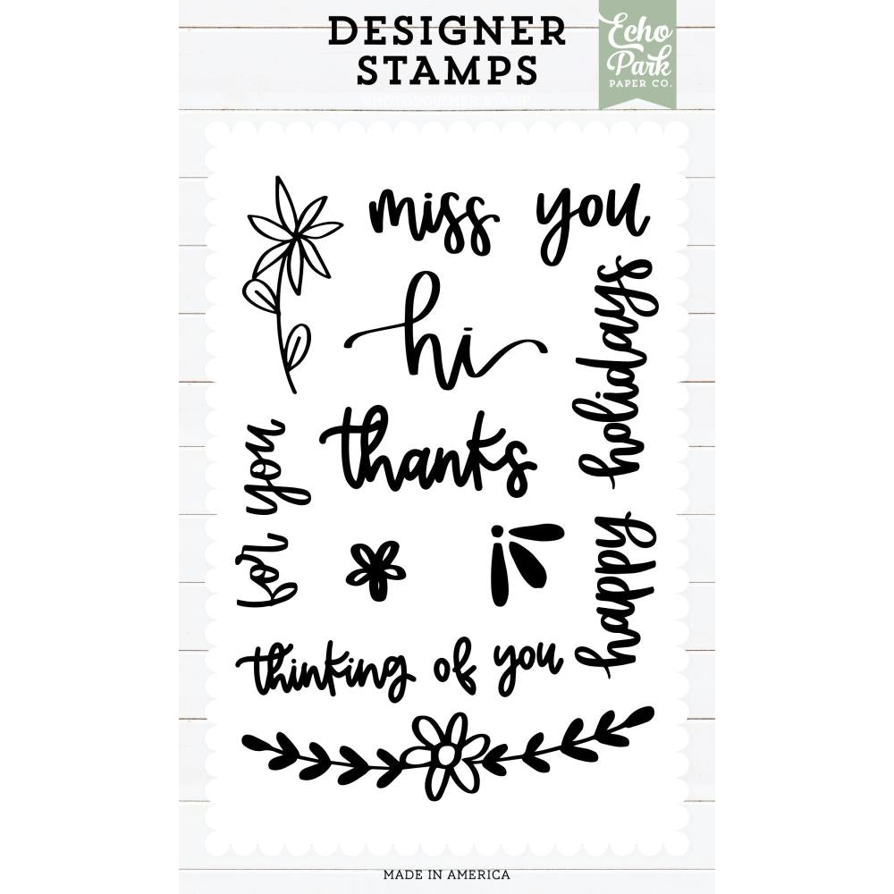 The Echo Park Miss You Sentiments Clear Stamps are ideal for enhancing your paper craft projects. This set includes 12 clear stamps with exquisite detail, perfect for adding wonderful designs to greeting cards, scrapbook pages, gift cards, bookmarks, and more. Designs feature script sentiments and flowers. Simply mount the stamps on an acrylic block or stamp press (sold separately) and let your creativity flow. Each set comes at a convenient size of 4 x 6 inches.