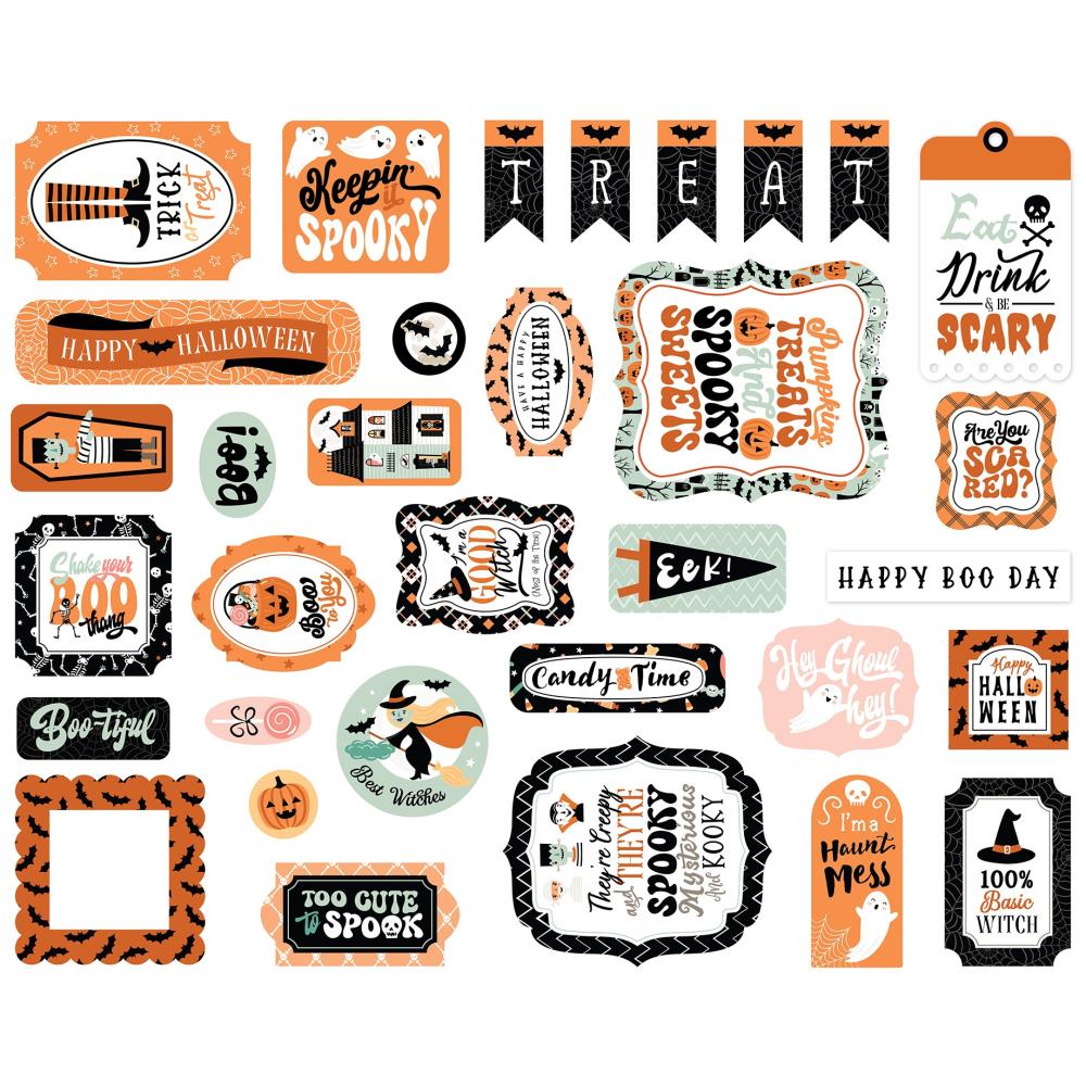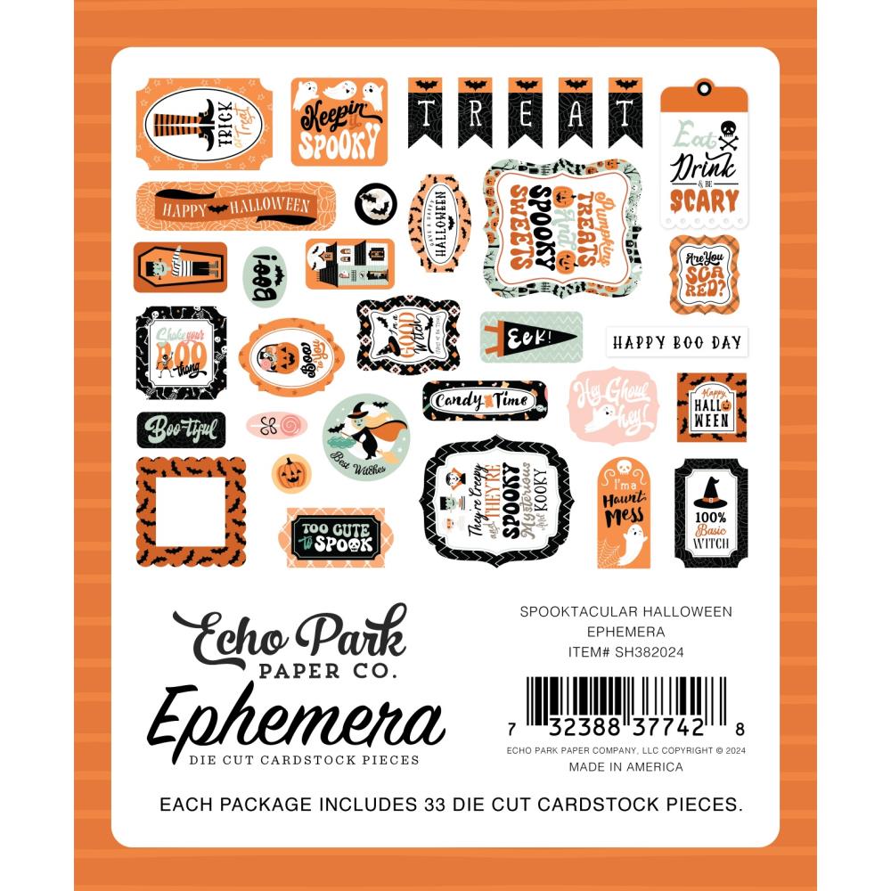 Enhance your project with Echo Park's Spooktacular Halloween Ephemera. Carefully selected and crafted, these pieces add whimsy, dimension, and style to all your creative endeavors. In this compact 4.5 x 5.2 inch package, you'll find 33 intricately designed ephemera including spooky Halloween imagery of candy, vampires, mummies, witches, ghosts, skeletons, and more. With a color scheme including orange, pink, aqua, white, and black, these embellishments will bring your project to life.