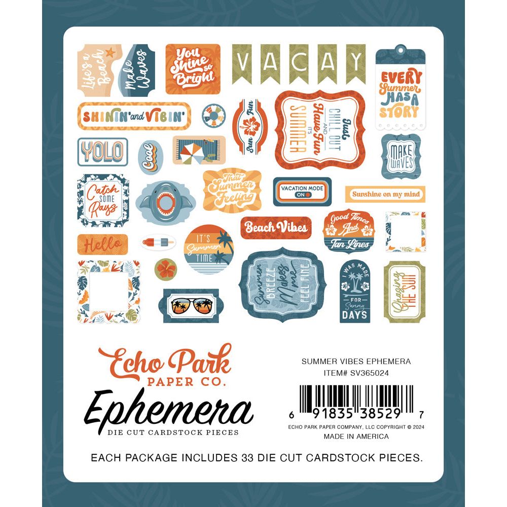For the ideal starting point for your project, as well as the ideal finishing touch, it's essential to have both the perfect paper and embellishments. These versatile pieces can bring playfulness, depth, color, and flair to various forms of paper crafting, such as cards, scrapbook layouts, and mixed media projects. This 4.5 x 6.5 inch package contains 33 ephemera pieces, featuring a variety of beach-themed imagery, including towels, umbrellas, floats, sunglasses, surfboards, palm trees, waves, and vibrant tropical flowers and leaves in hues of red, orange, yellow, blue, and green.