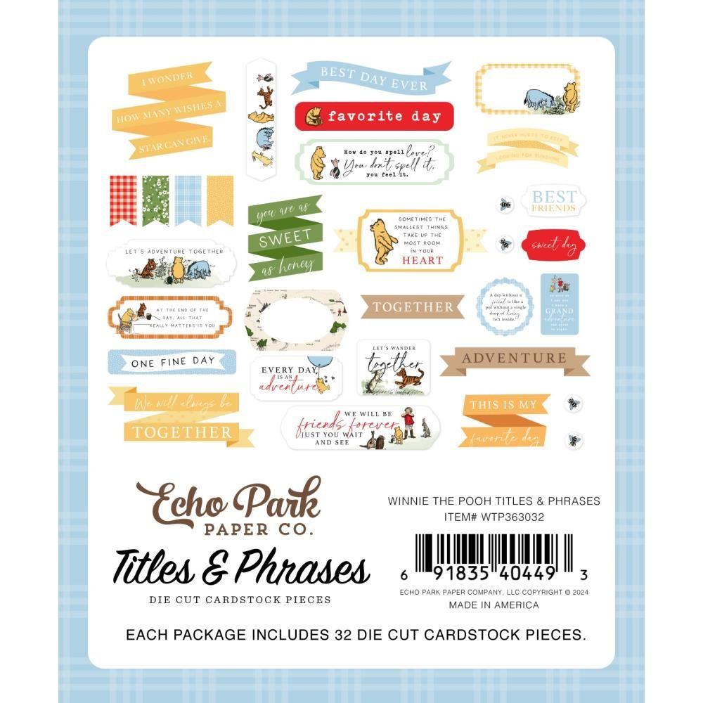 Enhance your crafting projects with Echo Park's Winnie the Pooh Titles and Phrases. This 4.5 x 6.5 inch ephemera pack includes 34 pieces featuring beloved characters like Pooh, Tigger, and Piglet, as well as fun imagery like honey pots and balloons. Add dimension and style to your creations with this colorful and whimsical embellishment pack.