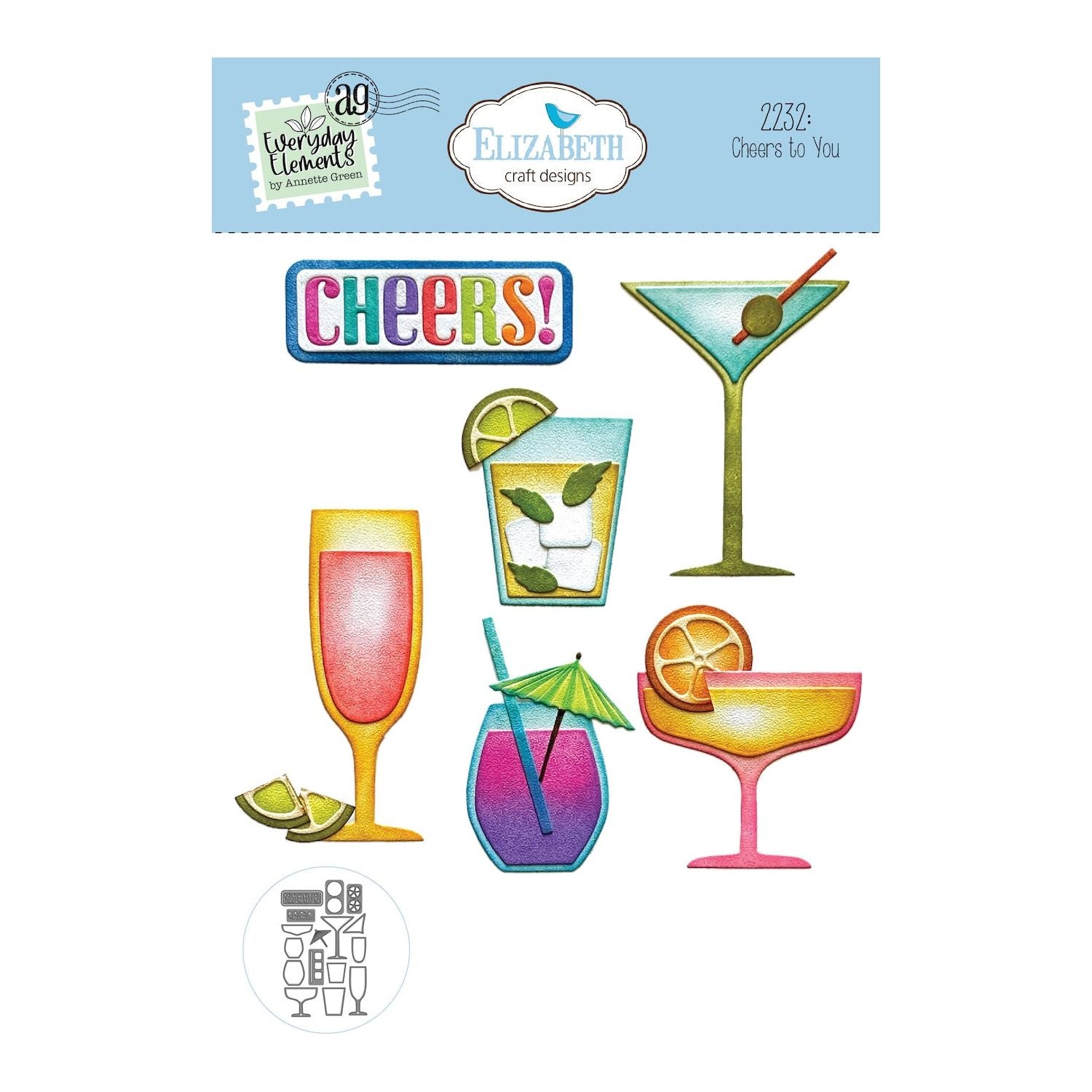 Elizabeth Craft Designs Cheers to You Dies are part of the Sunny Days Collection from Everyday Elements, designed by Annette Green. This versatile die set allows you to create bold, festive drink designs, including martini, rocks, margarita, and wine glasses, along with fun accessories like fruit garnishes, ice cubes, straws, mint leaves, olives, and umbrellas—perfect for crafting bright, cheerful cards, invitations, and more. Also included is an uppercase "Cheers" sentiment, making this set a must-have for celebrations all year long. This set includes 17 thin metal dies, with the largest die measuring approximately 2 x 2.6 inches (5 x 6.7 cm). Coordinates beautifully with Playful Sentiments Clear Stamps CS403.