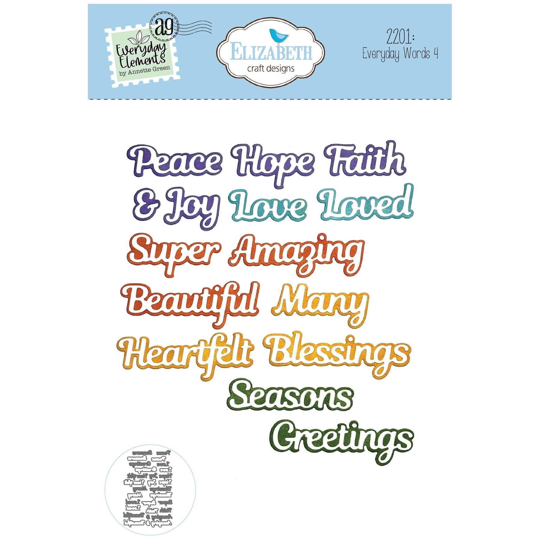 The Elizabeth Craft Designs Everyday Words 4 Dies are part of the Whispers of Nature Everyday Elements collection by Annette Green. This versatile wafer-thin die set includes 30 pieces, each word accompanied by a coordinating shadow die to add dimension to your projects. The largest die measures approximately 2.7 x 0.9 inches (6.9 x 2.4 cm). The set includes the words "Peace," "Hope," "Faith," "&," "Joy," "Love," "Loved," "Super," "Amazing," "Beautiful," "Many," "Heartfelt," "Blessings," "Seasons," and "Greetings." Perfect for adding heartfelt messages and expressive flair to a wide range of creative projects.