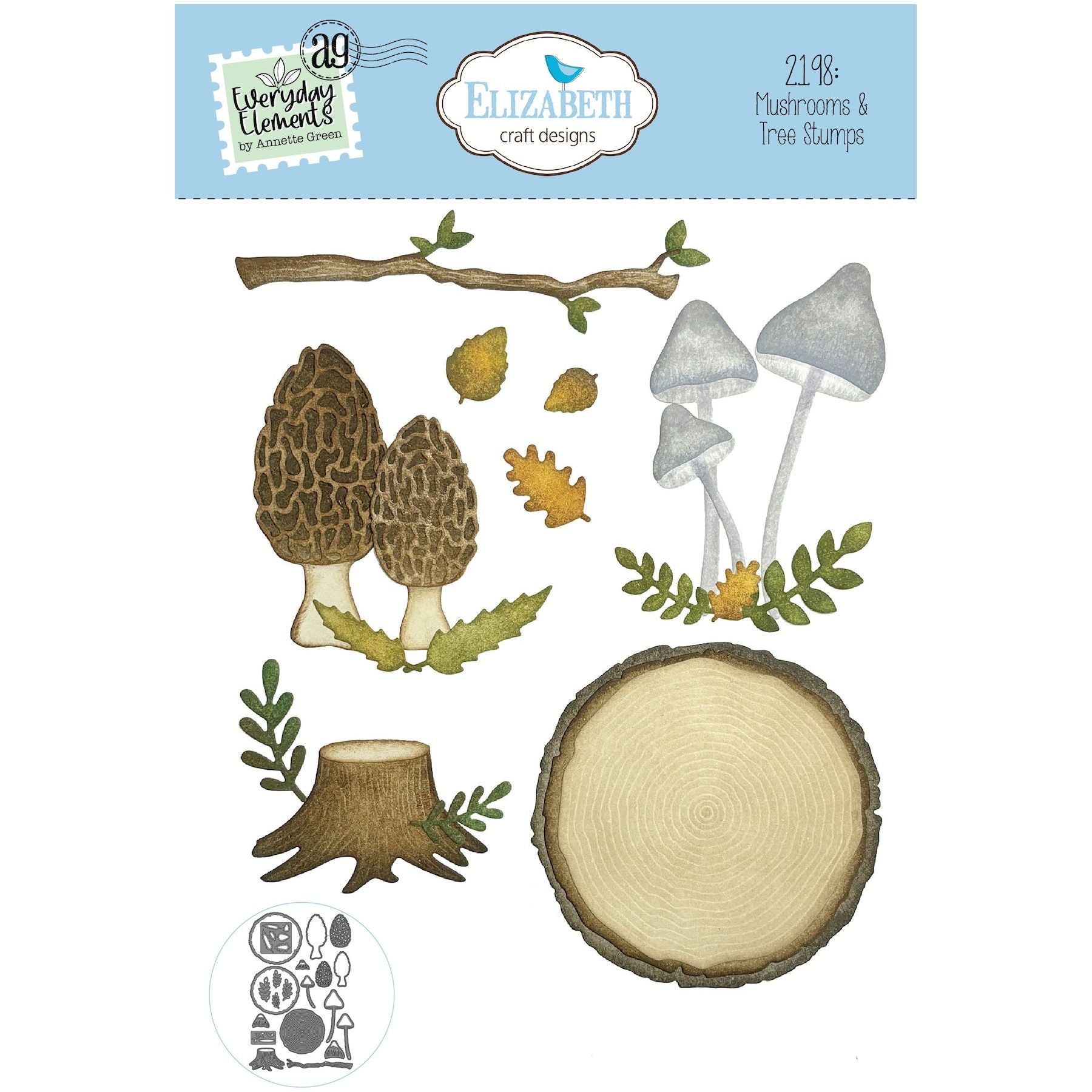 The Elizabeth Craft Designs Mushrooms and Tree Stumps Dies are part of the Whispers of Nature Everyday Elements collection by Annette Green. This wafer-thin die set includes 21 pieces, with the largest piece measuring approximately 3.1 x 3.1 inches (7.8 x 7.8 cm). The set features a variety of woodland elements, including a piece of sliced wood, a trio of mushrooms, two morel mushrooms, a tree stump, a branch, and various leaves and greenery. Perfect for adding earthy details and natural textures to your crafting projects.