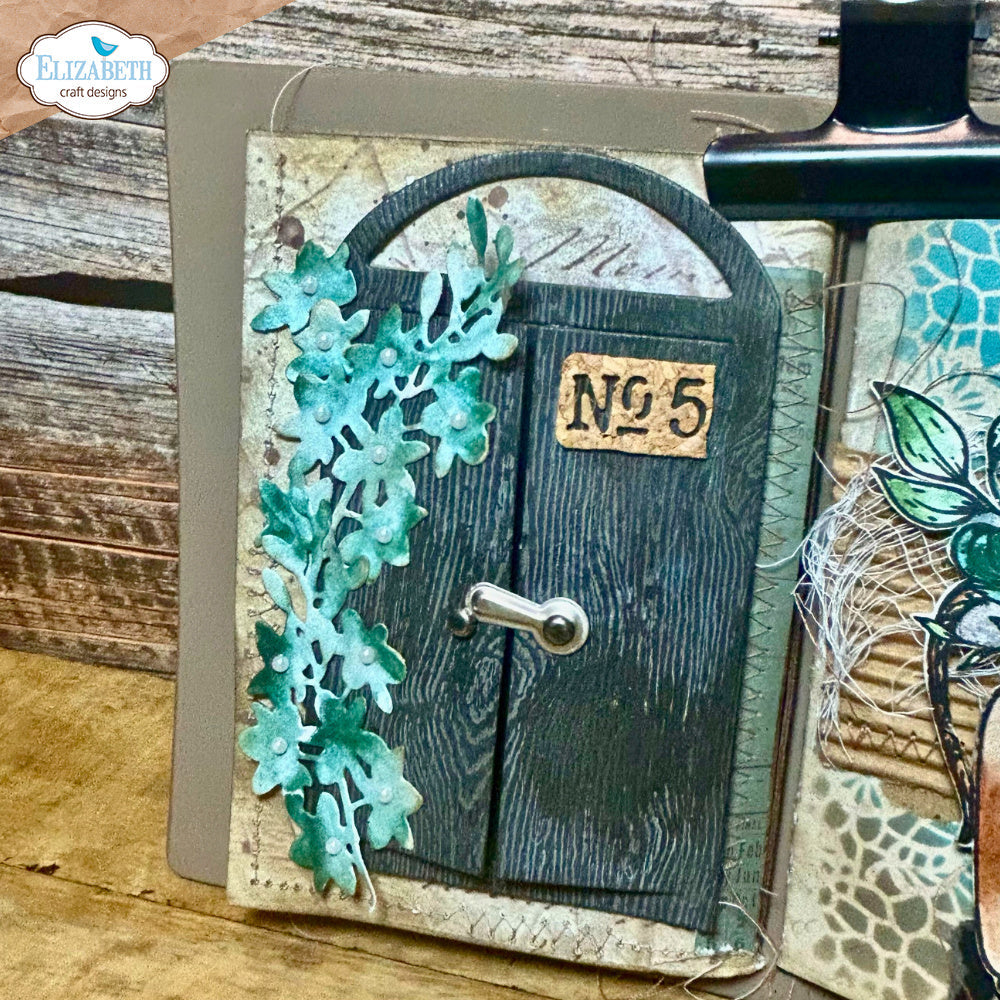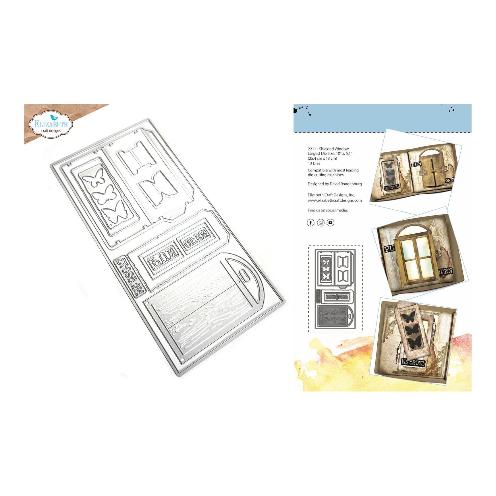 Elizabeth Craft Designs Shielded Window Dies are part of the Art Journal Specials Hinged to the Past Collection. This set includes 12 wafer-thin dies, with the largest die measuring approximately 10 x 5.1 inches. The set allows you to create wood-grain doors with an arched window on top, along with additional elements like a pocket, butterflies, tabs, a tag, "No.52073," the words "Fun" and "Open," and rectangle frames. Perfect for adding intricate and interactive details to your journals, cards, or mixed media projects.