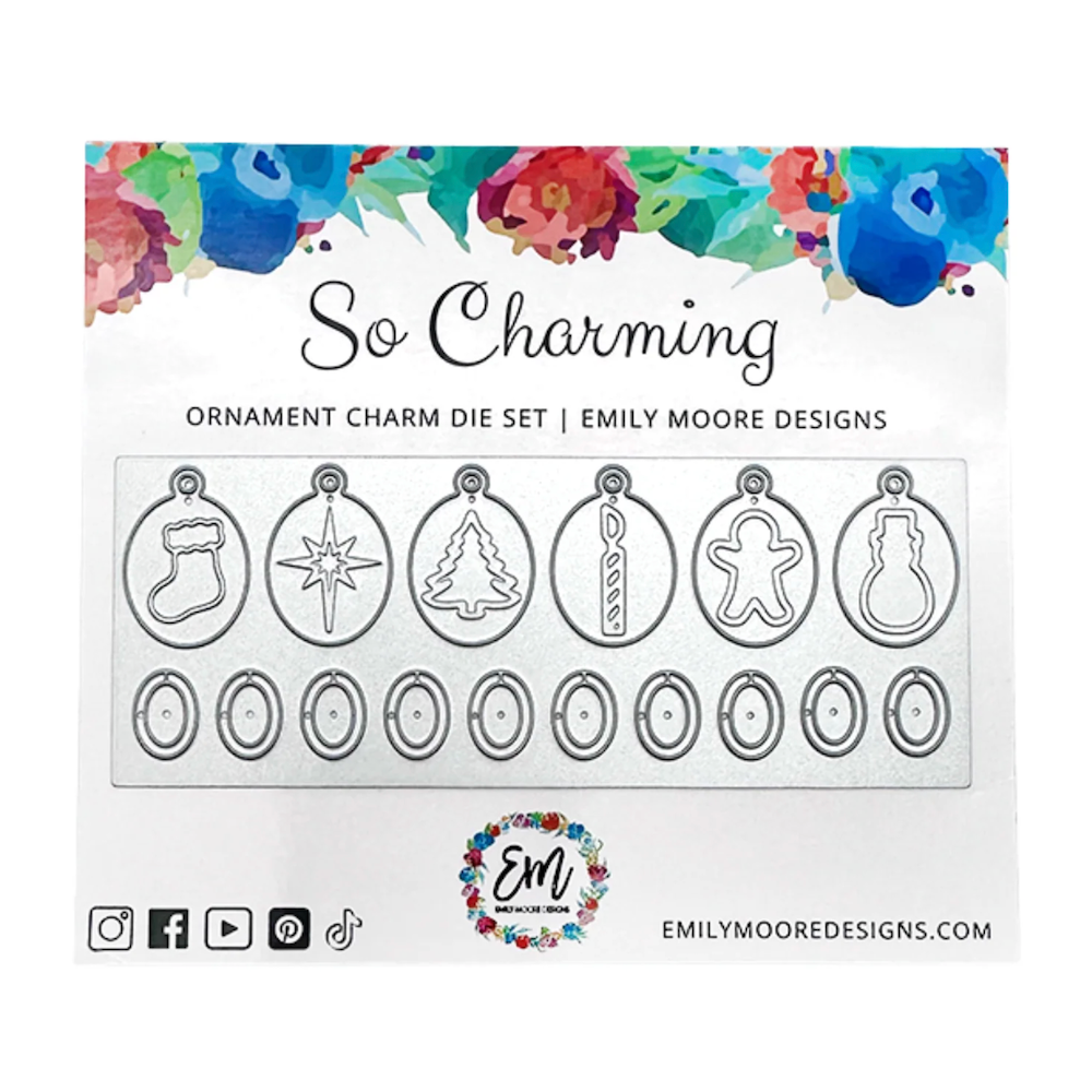The Emily Moore Designs So Charming Die Set includes 6 debossed charms—a candle, stocking, gingerbread figure, star, Christmas tree and snowman—plus 10 loops with pre-cut slits for attaching to ornament toppers. Designed to coordinate with the Ornament Nested Die Set and Ornament Gift Card Holder Die, these 1 x 0.75-inch charms add a personalized touch to your holiday projects. All pieces come on a 4.75 x 2-inch metal sheet for one-pass cutting. Compatible with most die-cutting machines.