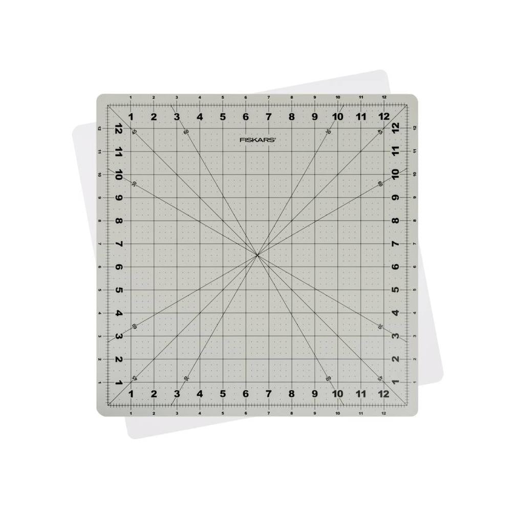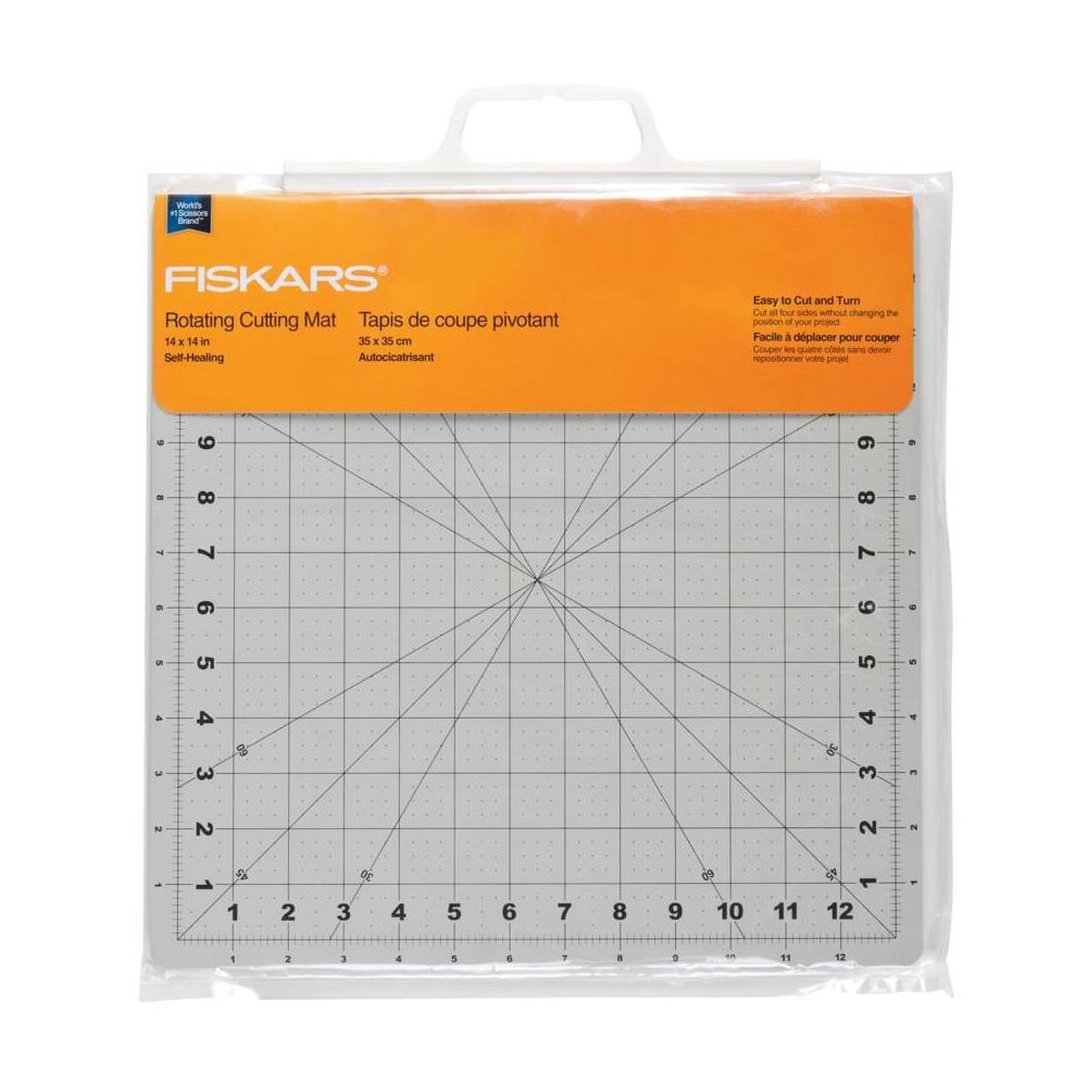 The Fiskars Rotating Cutting Mat simplifies squaring off large quilting blocks up to 12.5 inches and is the perfect addition to a rotary cutter and ruler for preserving workspace surfaces. Experience quick and convenient action when cutting applique designs and fabric squares with an easy-to-read measuring grid and 30-, 45-, and 60-degree bias lines. This rotating mat's high-quality, self-healing material is perfect for use with a rotary cutter, protecting work surfaces. It is best stored flat, away from sunlight and extreme temperatures, and can be washed with warm water and a mild soap. Cutting grid dimensions for the rotating cutting mat: 13X13 inches, and the full, edge-to-edge measurement for the mat: 14x14 inches.