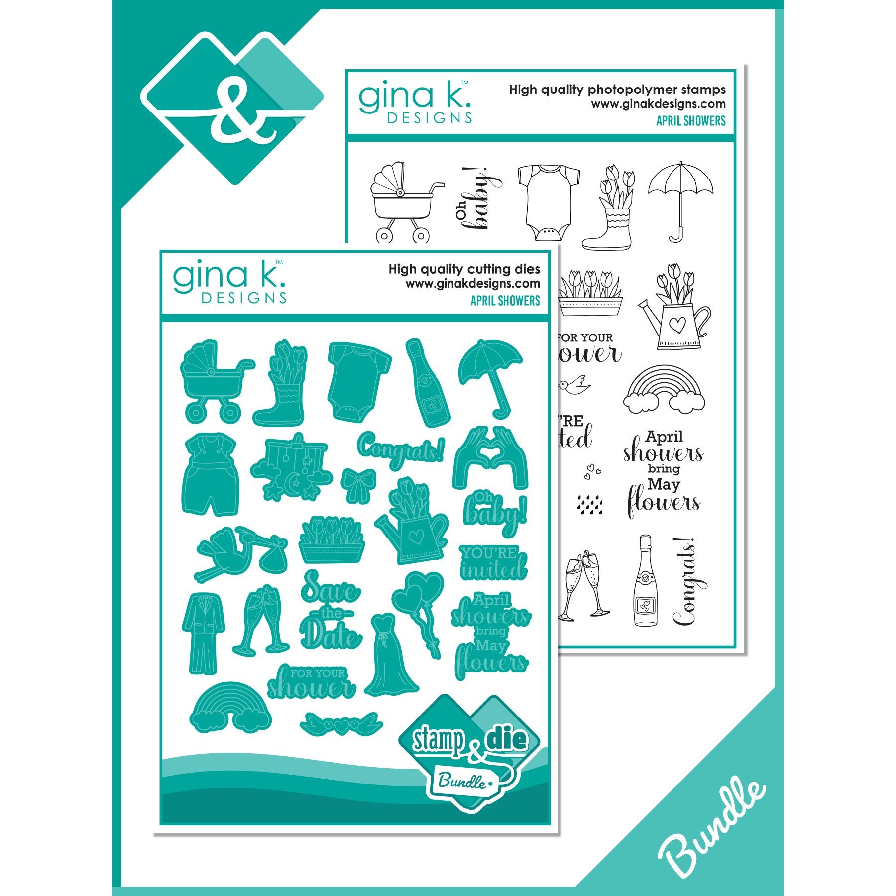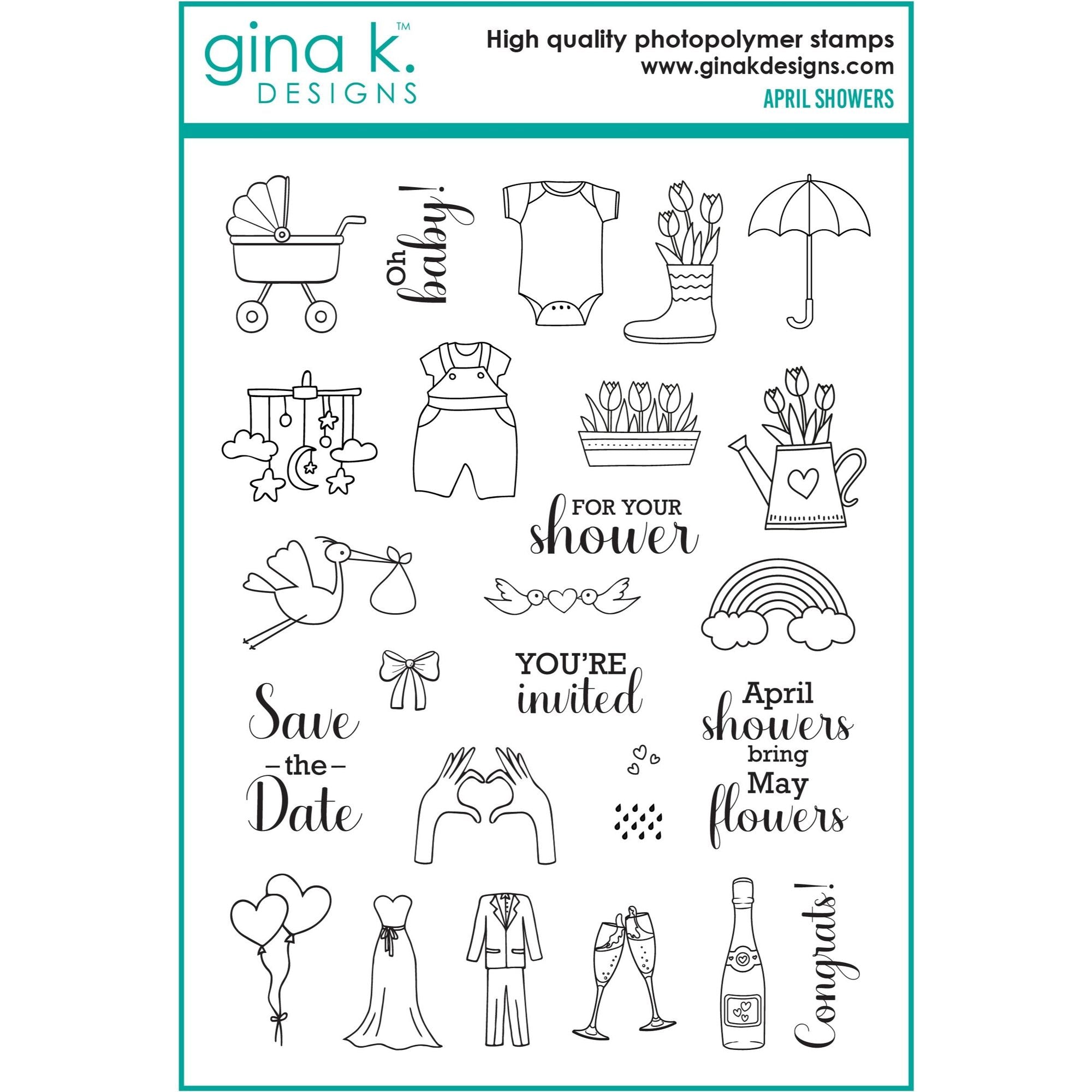 Get ready for Spring with this adorable Gina K Designs April Showers Clear Stamp and Die Bundle! Perfect for baby showers, weddings, and more, this set features 26 fun and quirky designs, including a stroller, stork, and heart-shaped balloons. Don't miss out on all the festivities with this playful 6x8 inch set. As a special bonus this bundle includes the coordinating dies for almost every stamp included in the set! Sentiments included: