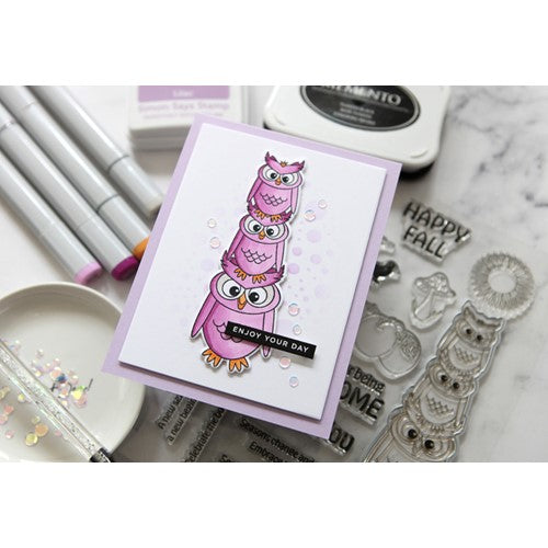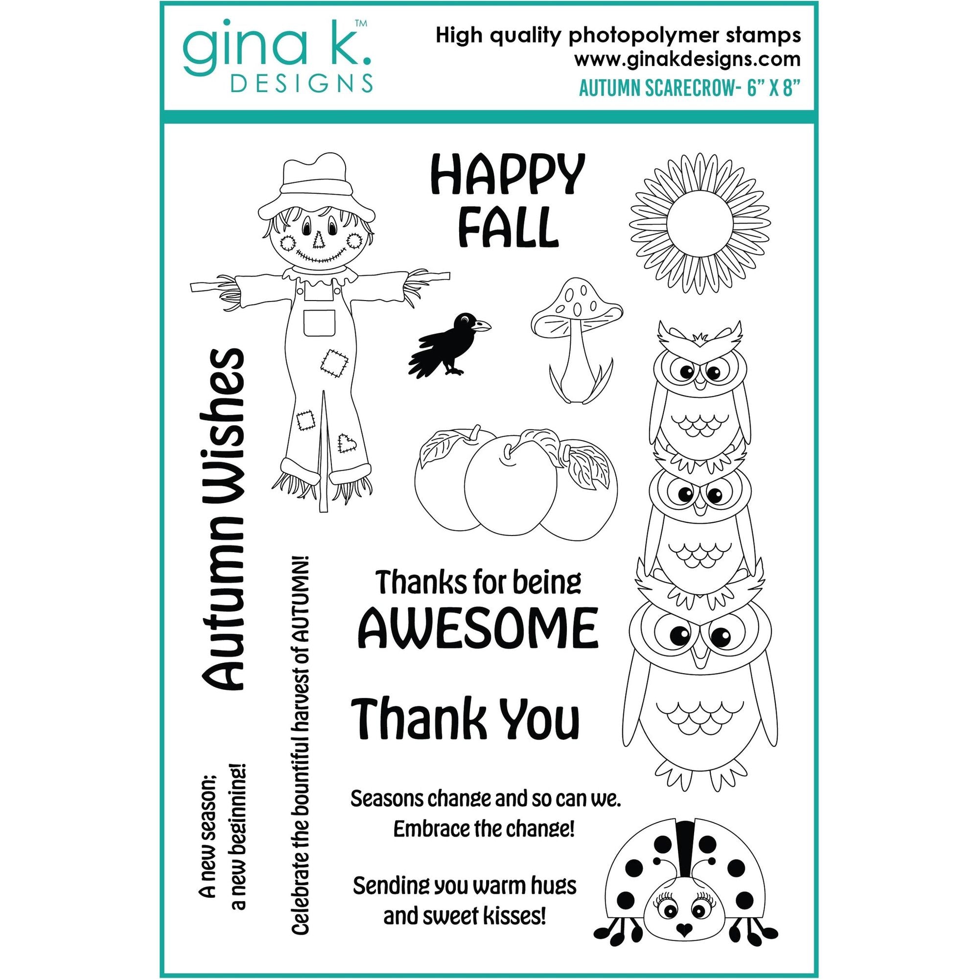 This adorable 6x8 inch clear stamp set calls out to the fans of the Autumn season with adorable imagery of a scarecrow, stacked owls, a ladybug, apples, mushroom, crow, and sunflower as well as the following words or sentiments: Happy fall, Autumn wishes, Thanks for being awesome, Thank you, A new season; a new beginning, Celebrate the bountiful harvest of autumn, Seasons change and so can we embrace the change, and Sending warm hugs and sweet kisses.