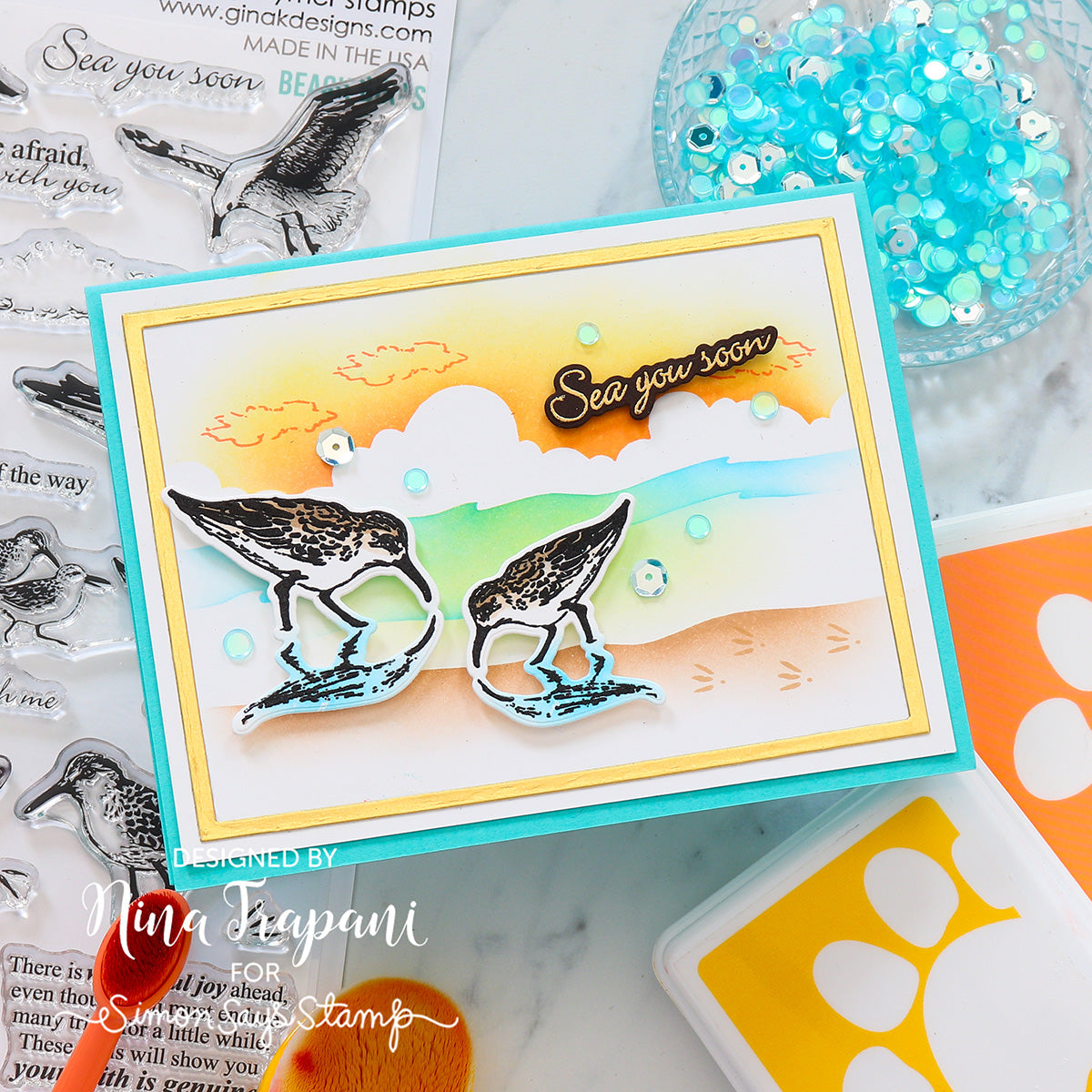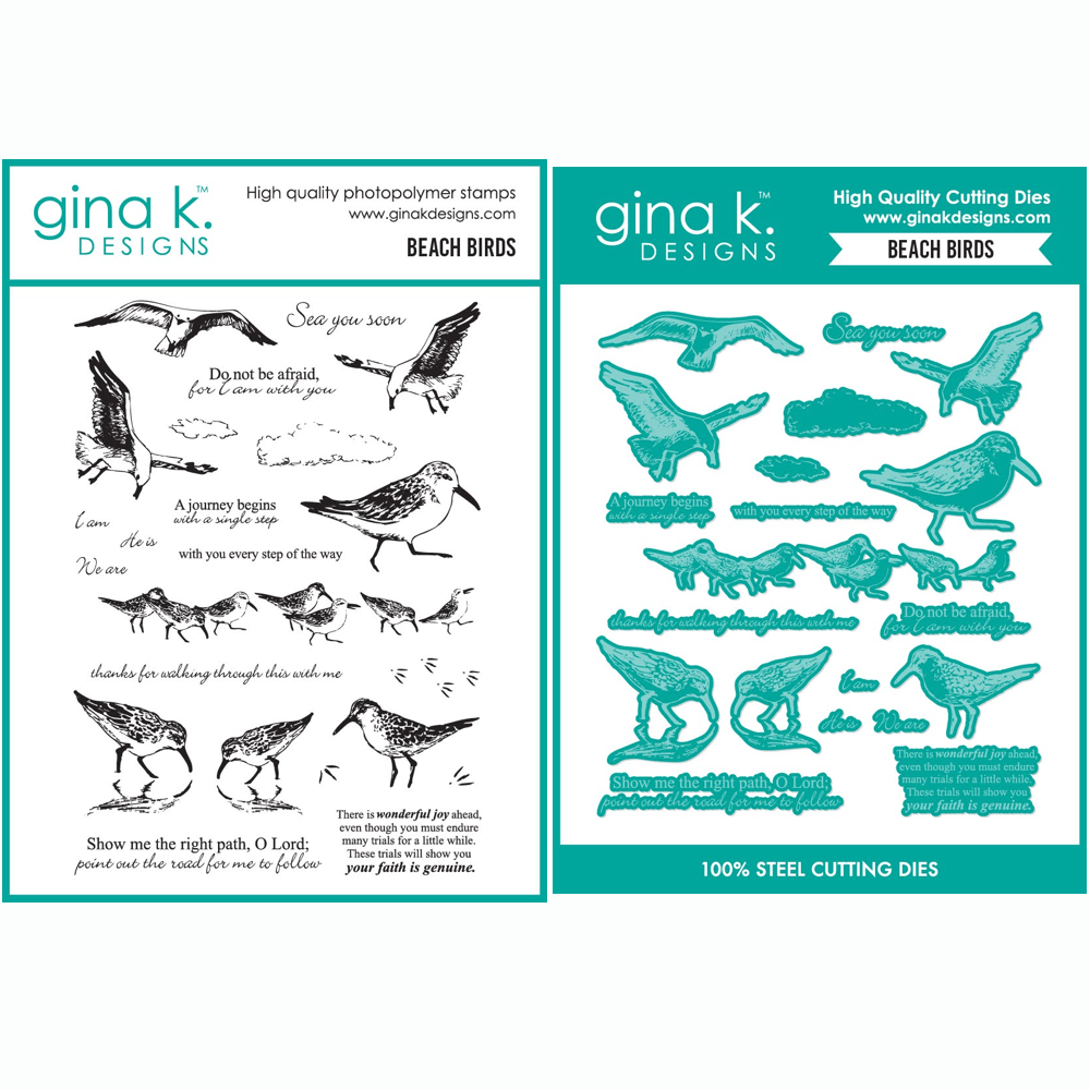 Capture the serene beauty of the shore with the Gina K Designs Beach Birds Stamps and Dies Set. This 6x8 inch clear stamp set features majestic and charming birds alongside heartfelt, faith-inspired sentiments. Perfect for adding a playful yet meaningful touch to your cards and crafts, it brings a peaceful beach vibe infused with uplifting messages. Let your creativity soar with these delightful stamps that celebrate nature and spirituality in harmony. As a special bonus, this bundle includes the coordinating die set for perfect die cut results every time! Words and sentiments included: