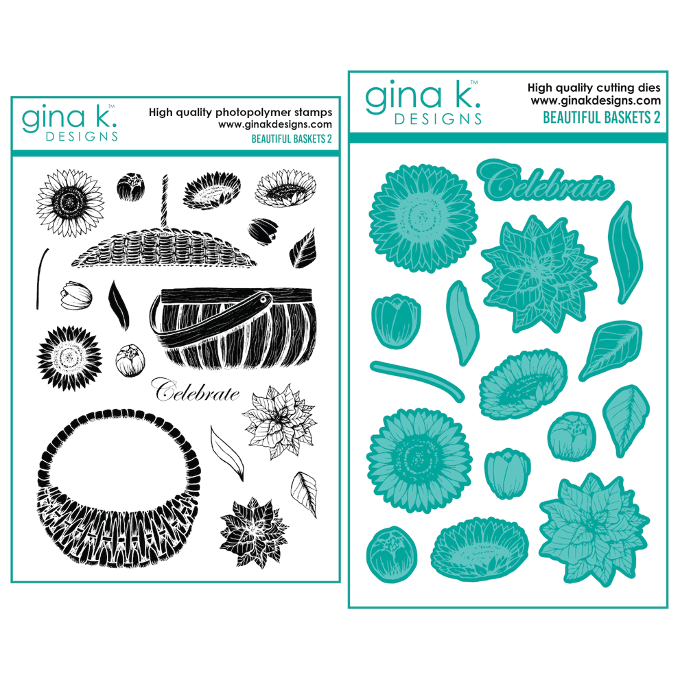 Unlock more creative possibilities with this 19 piece 6x8 inch clear stamp set from Gina K Designs. Featuring 3 basket varieties, sunflowers, tulips, poinsettias and leaves, it's perfect for crafting holiday cards and decorations. Plus, it comes with the word 'Celebrate', to make your projects even more special! As a special bonus, this stamp and die set includes the dies that cut out every component of the stamp set except the baskets!