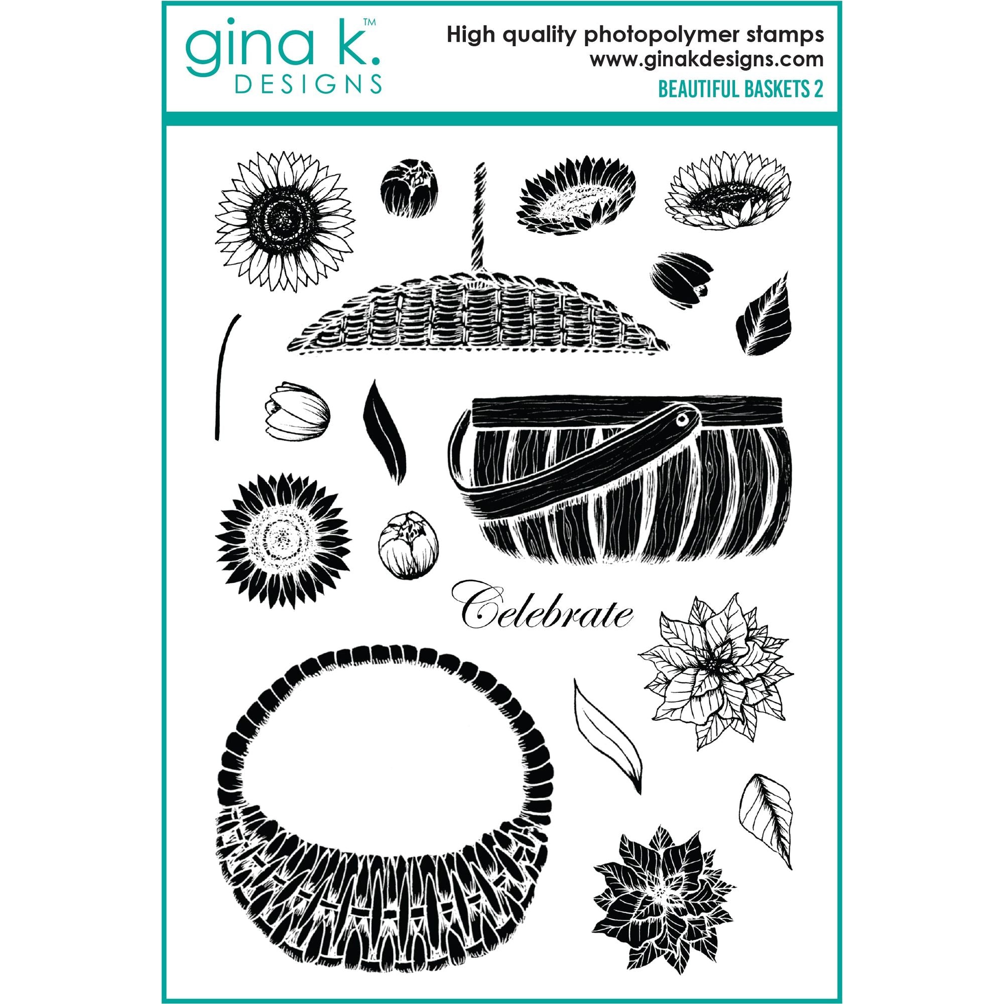 Unlock more creative possibilities with this 19 piece 6x8 inch clear stamp set from Gina K Designs. Featuring 3 basket varieties, sunflowers, tulips, poinsettias and leaves, it's perfect for crafting holiday cards and decorations. Plus, it comes with the word 'Celebrate', to make your projects even more special!