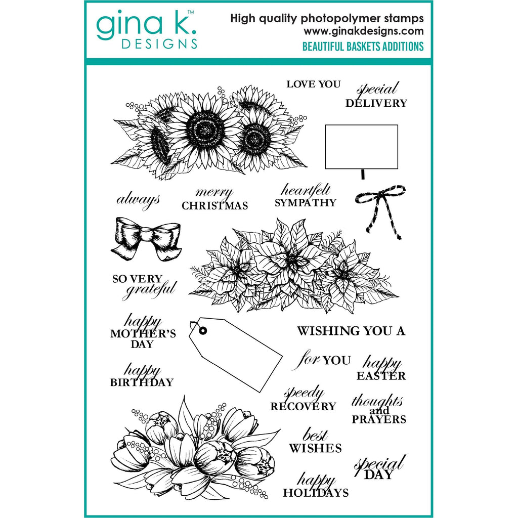 Gina K Designs' Beautiful Baskets Additions Clear Stamps are the perfect way to add warmth and charm to your card designs. This 6x8 inch 23-piece set includes sunflowers, poinsettias, and tulips plus a blank sign, twine bow, and ribbon bow. Enhance your Birthday, Holiday, Sympathy cards and more with this delightful set that also includes sentiments in a print/cursive combination font.