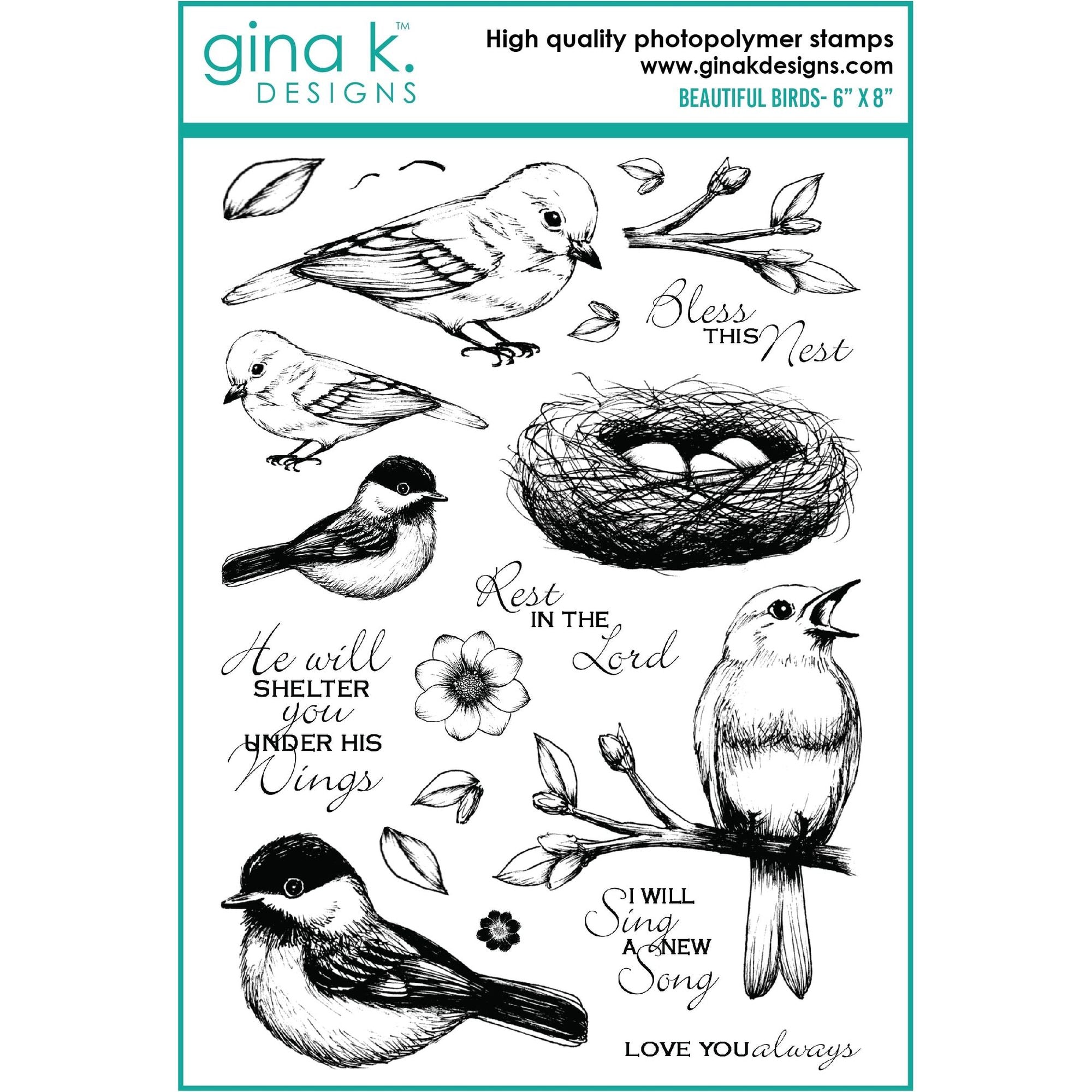 This 6x8 inch clear stamp set is gorgeous and so lifelike! Containing 5 unique bird images and the following sentiments: Bless this nest, Rest in the Lord, He will shelter you under his wings, I will sing a new song, and Love you always.