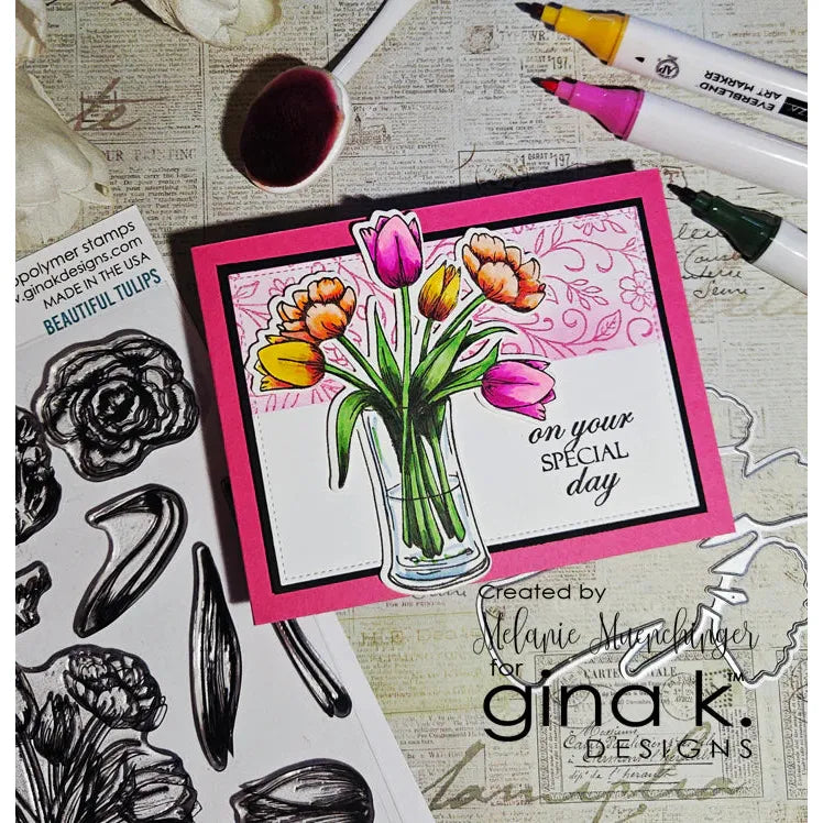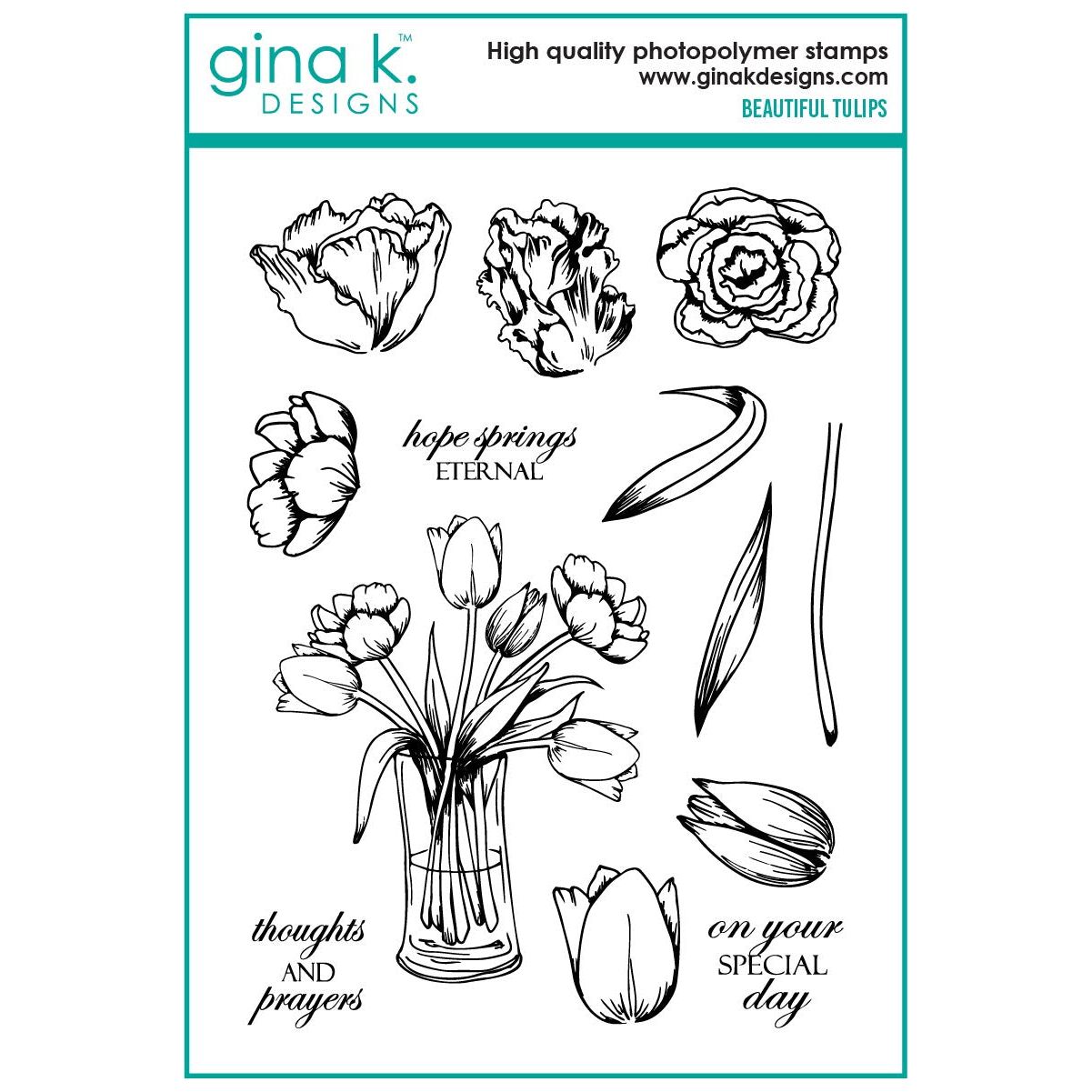Create elegant floral designs effortlessly with the Gina K Designs Beautiful Tulips Stamps. This 6x8 inch clear stamp set features a detailed bouquet of tulips in a vase, along with separate tulip stems, leaves, and blooms, allowing you to build layered, unique compositions. Included are three sentiments to complement your projects, making it ideal for cards, tags, scrapbook pages, and more. Perfect for adding a sophisticated touch to your crafting with precision and versatility. Sentiments included: