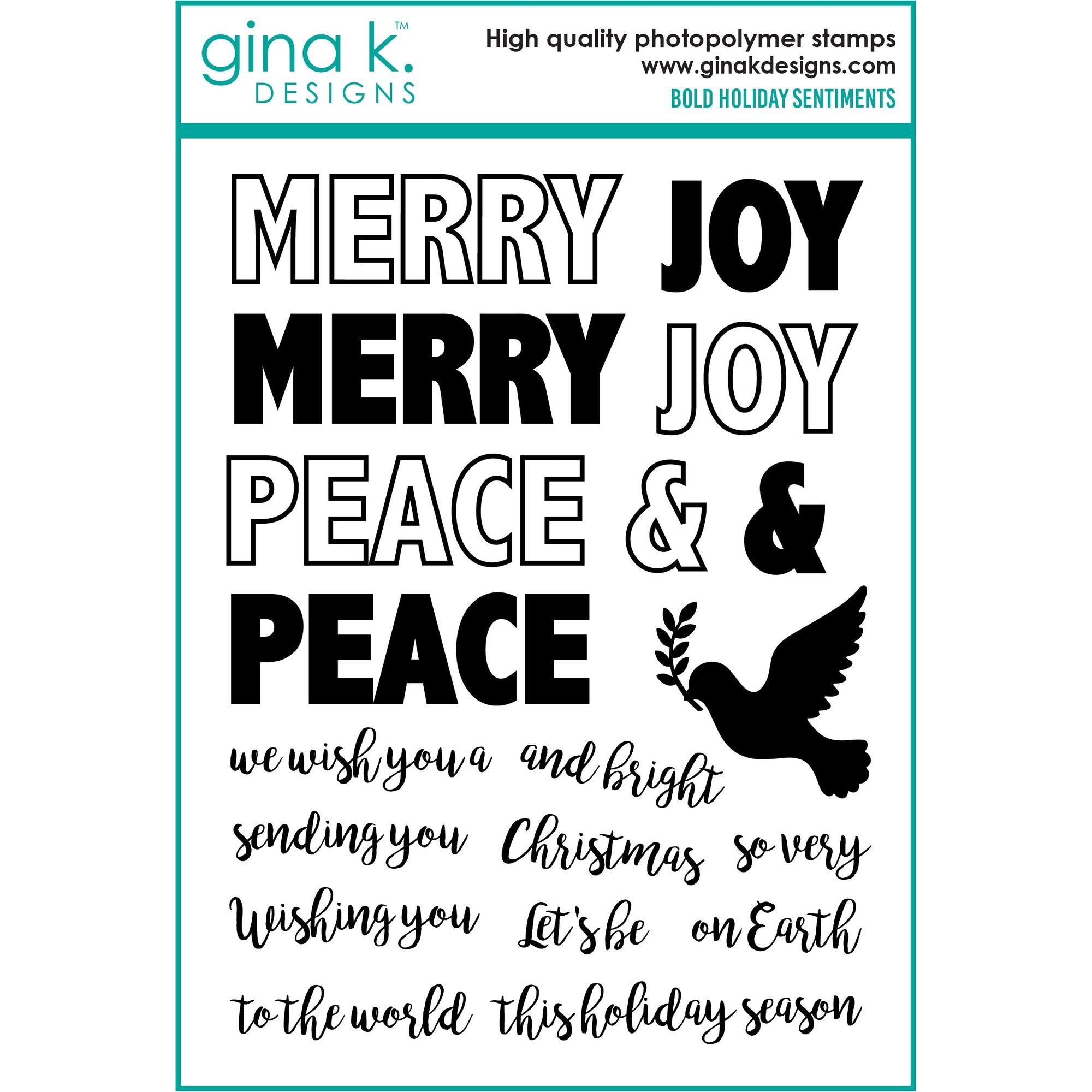 Elevate your holiday crafts with Gina K Designs Bold Holiday Sentiments Clear Stamps. This versatile 6x8 inch stamp set includes outline and solid stamps featuring 'Merry', 'Joy', 'Peace', and an ampersand. Plus, a stunning dove silhouette and cursive sentiments add the perfect finishing touch. Make beautiful cards and tags in no time! Partial sentiments in a cursive font included: