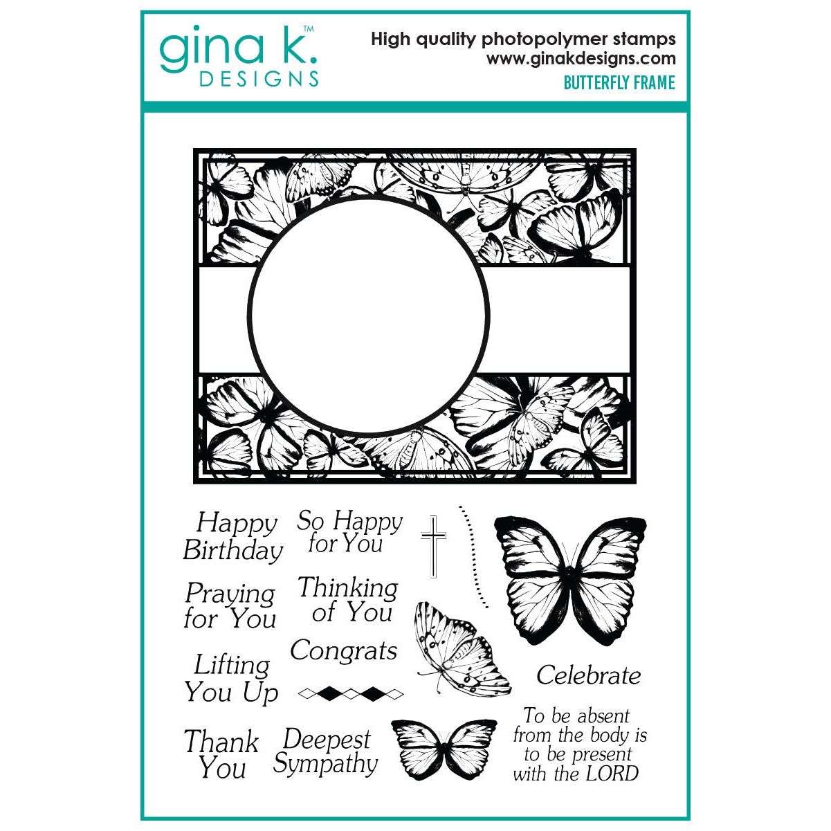 Introducing the Gina K Designs Butterfly Frame Stamps. This 6x8 inch 17-piece set features a stunning, customizable butterfly frame design, along with individual butterflies, sentiments, and a cross. Perfect for butterfly enthusiasts, this set will add a touch of elegance to any project. Words and sentiments included: