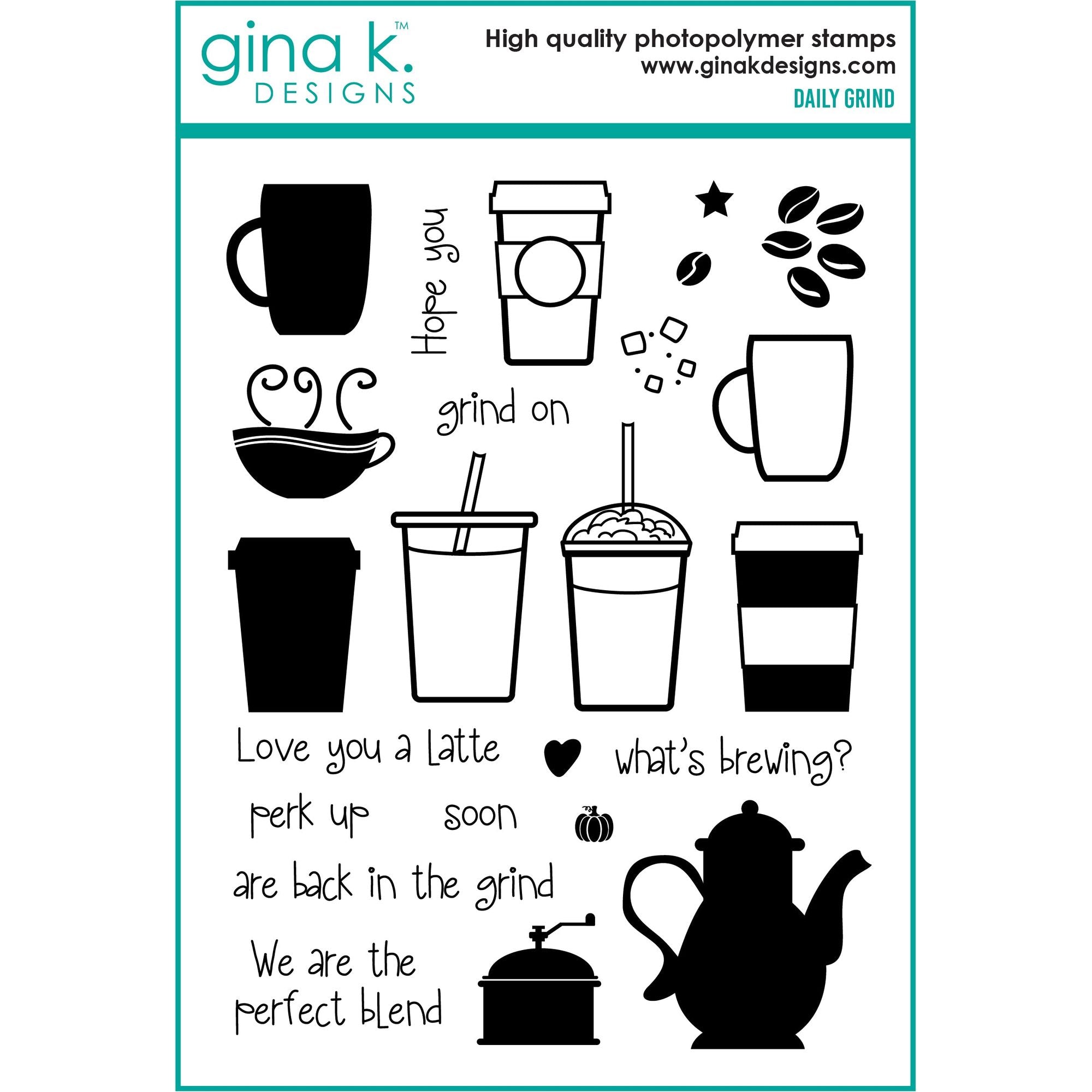 Introducing the ultimate set for coffee lovers - Gina K Designs Daily Grind Clear Stamps! Express your caffeine addiction with silhouette and outline images of mugs, to-go cups, and even a grinder and teapot. Make fun and punny cards with this versatile 6x8 inch set. (Coffee not included!) Sentiments include: