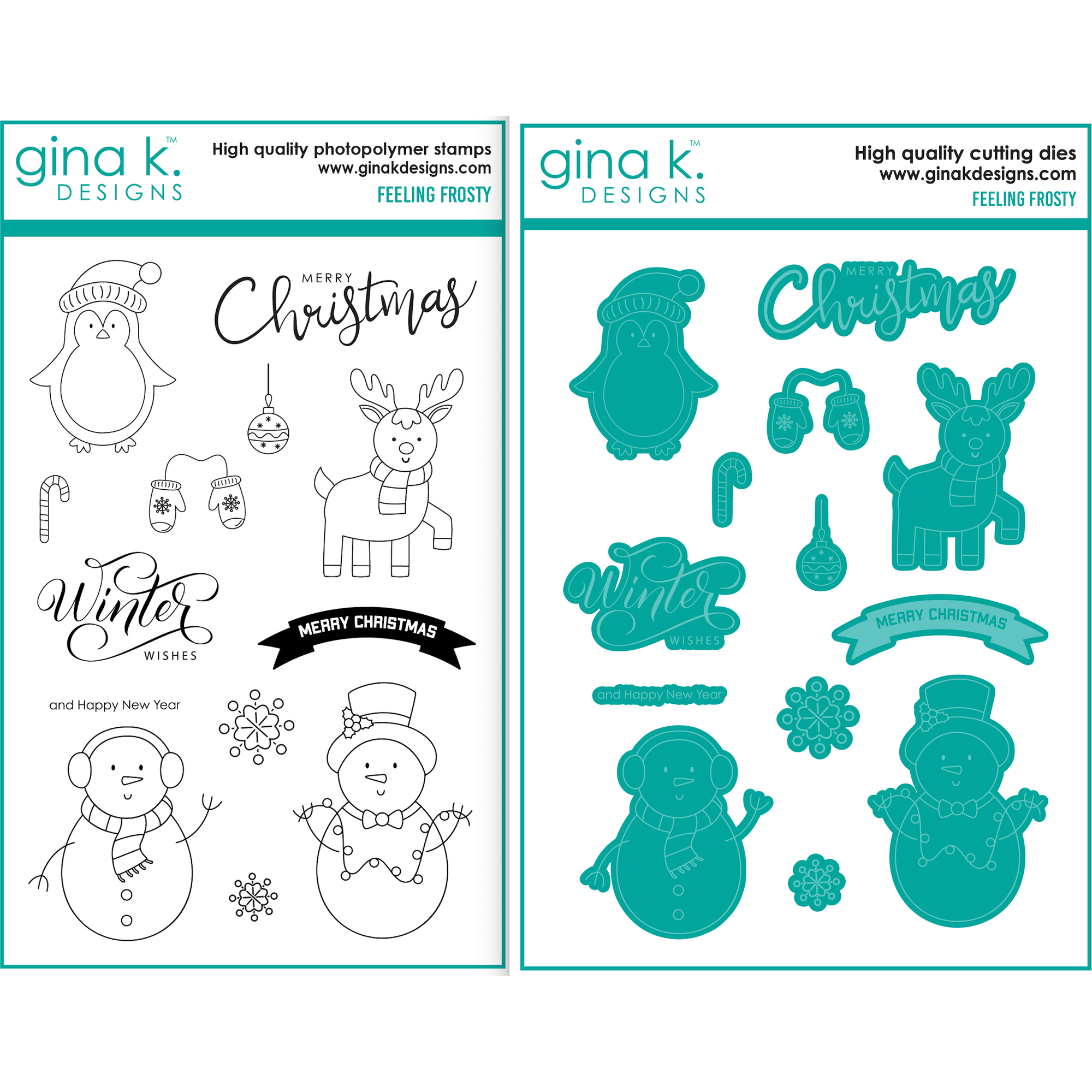 Gina K Designs Feeling Frosty Clear Stamps and Dies Set provide quick and easy access to create impressive holiday cards. This 4x6 inch set includes 13 pieces: a penguin with a Santa hat, a prancing reindeer, a snowman with earmuffs, and a snowman with ornaments. Accessories include an ornament, mittens, candy canes, and two unique snowflakes. Sentiments come in a mix of fonts for added variety. Also included in this set are the dies to cut out every single stamp in the stamp set! Sentiments included: