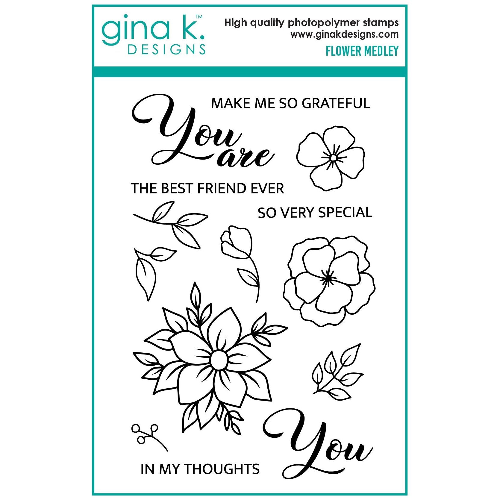 Unleash your creativity with the Gina K Designs Flower Medley Stamps. This exquisite 4x6 inch clear stamp set features 4 beautiful floral designs and foliage, as well as versatile words and sub-sentiments for endless combinations. Let your imagination bloom! Words and sub-sentiments included: