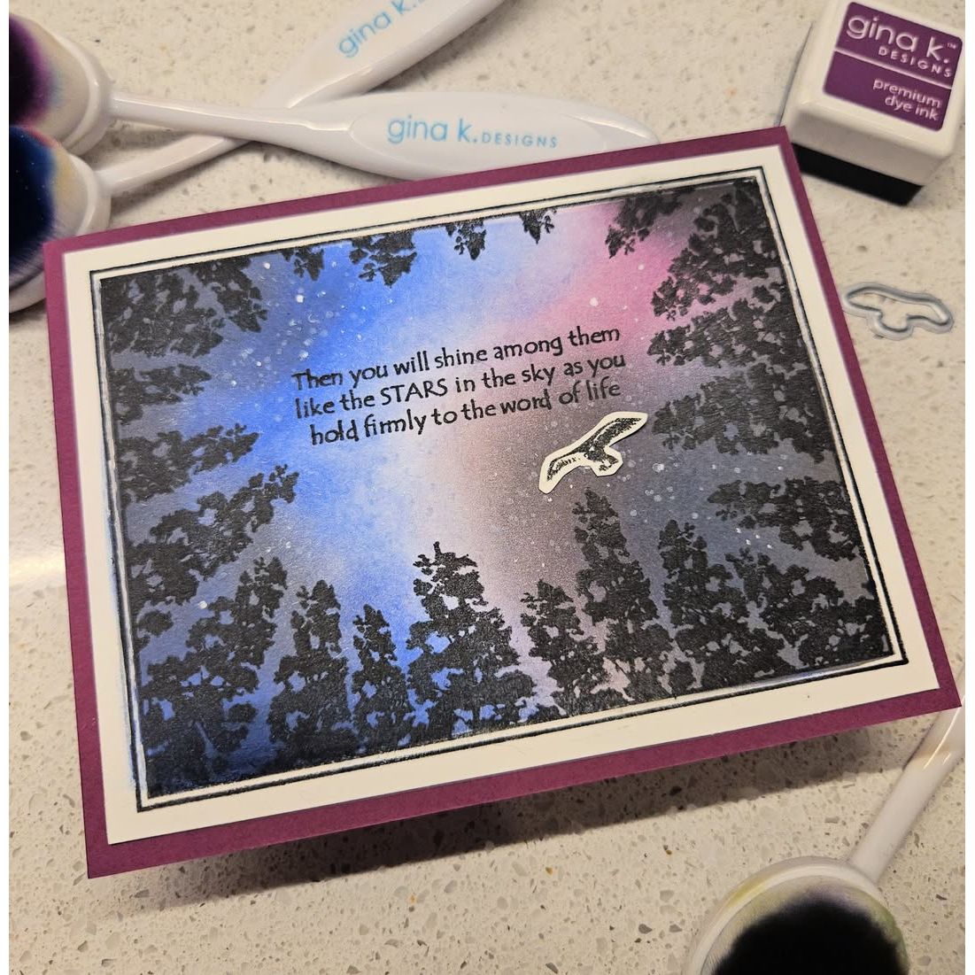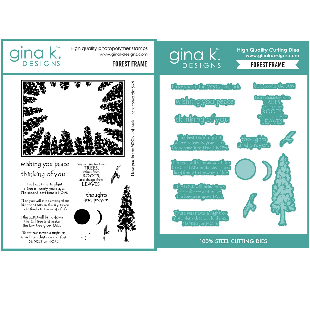 Craft exquisite, nature-inspired cards with the Gina K Designs Forest Frame Stamps and Dies. This elegant 6x8 inch clear stamp set captures a serene view through towering trees, featuring a detailed rectangular forest scene, a standalone tree, soaring birds, two moon phases, and shimmering stars. It also includes 10 thoughtfully designed sentiments to complement your projects, allowing you to create sophisticated, heartfelt designs that evoke the tranquility of the natural world. As a special bonus, this bundle includes coordinating dies for select featured stamps in the set for perfect die cut results every time! Sentiments included: