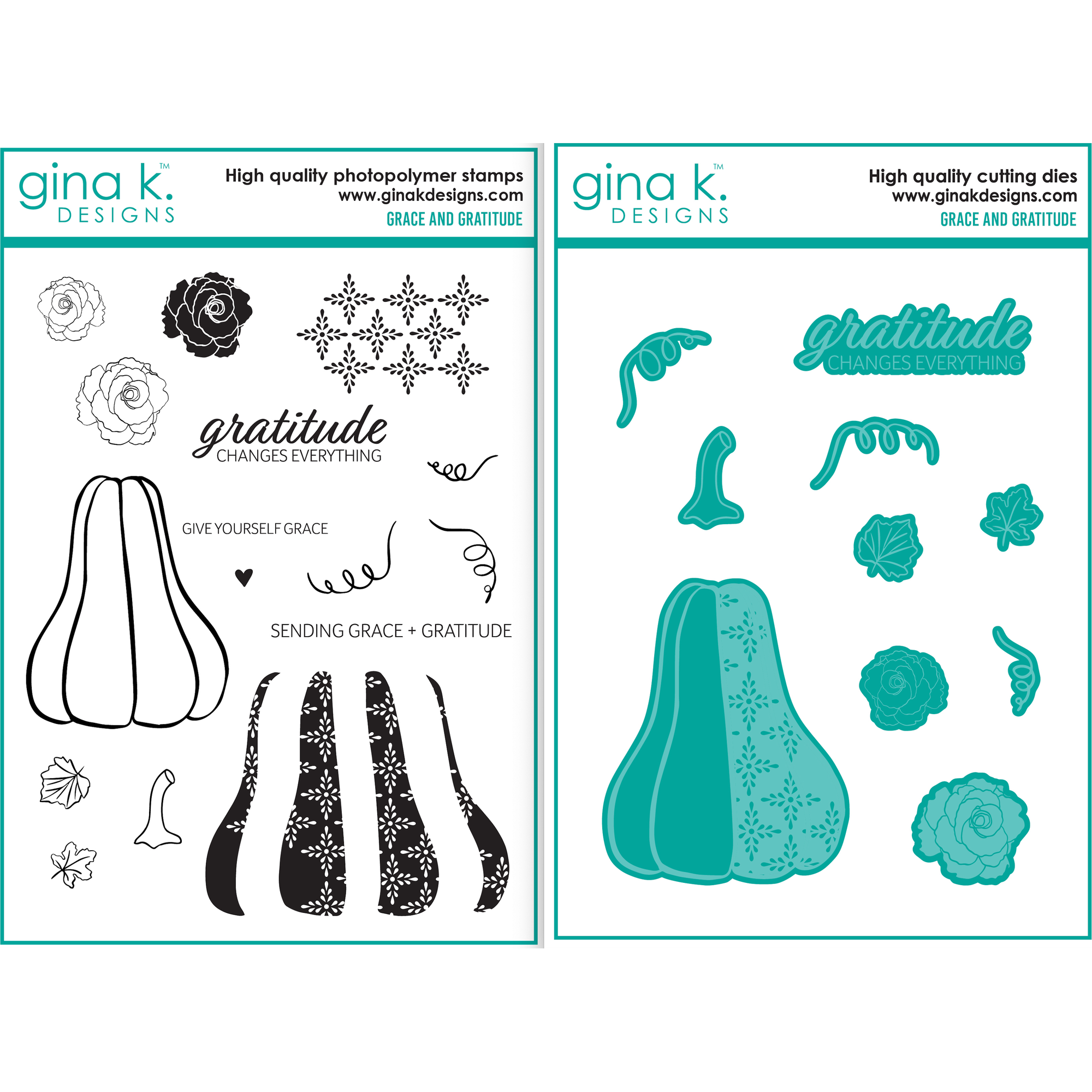 Create unique autumn designs with Gina K Designs' Grace and Gratitude Clear Stamps. This 16-piece (6x8 inch) set includes a large plain gourd image, stem, stump, tendrils, outline flowers, solid flower, background design, and solid heart. Perfect for all your seasonal crafting needs. This set also includes the coordinating dies to cut out the gourd, two flowers, two leaves, the stump, three tendrils, and one of the three sentiments included in the stamp set! Sentiments included: