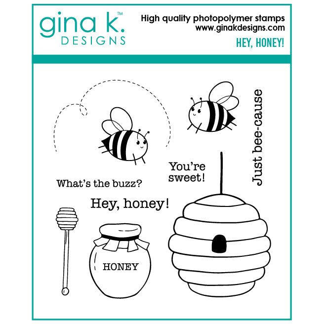 Celebrate your love for bees and clever wordplay with the Gina K Designs Hey, Honey! Stamps. This 4x4 inch clear set includes two charming bees, a flight trail, honey jar, beehive, honey dipper, and four witty sentiments. Perfect for crafting delightful cards, tags, and more, these stamps add a playful and sweet touch to your projects with expert-quality detail. Sentiments included: