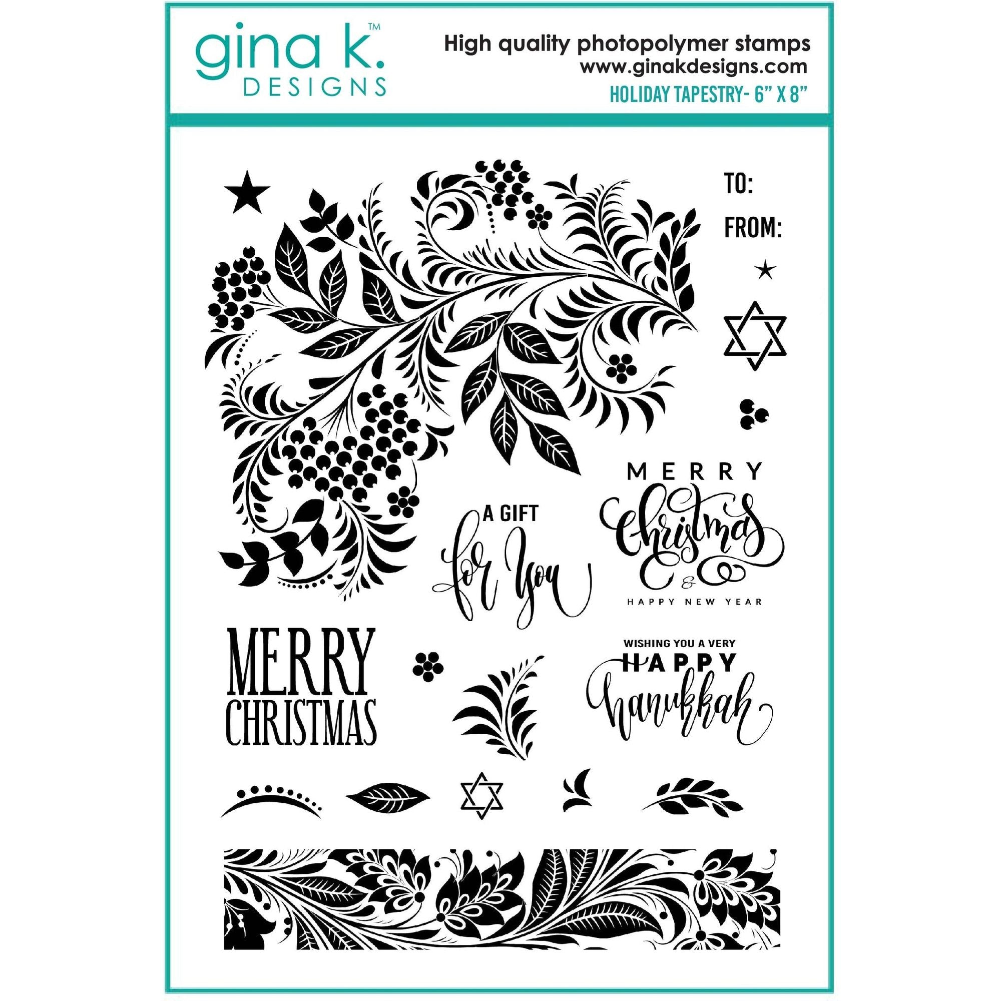 Holiday Tapestry is a stamp set by Gina K Designs. This set is made of premium clear photopolymer and measures 6 X 8 inches. Includes the sentiments: A gift for you, Merry Christmas, To and From, Wishing you a very Happy Hanukkah, and Merry Christmas and Happy New Year.