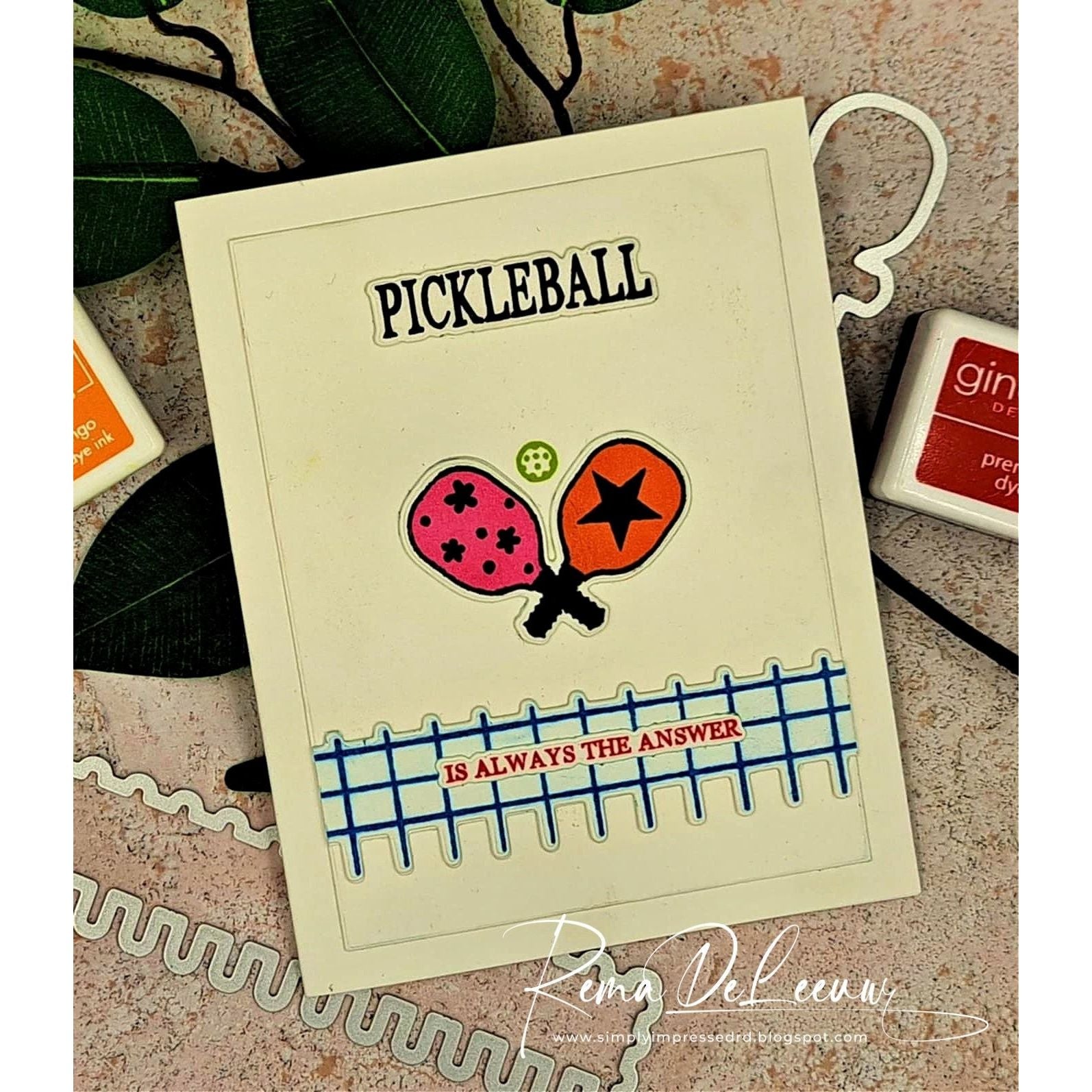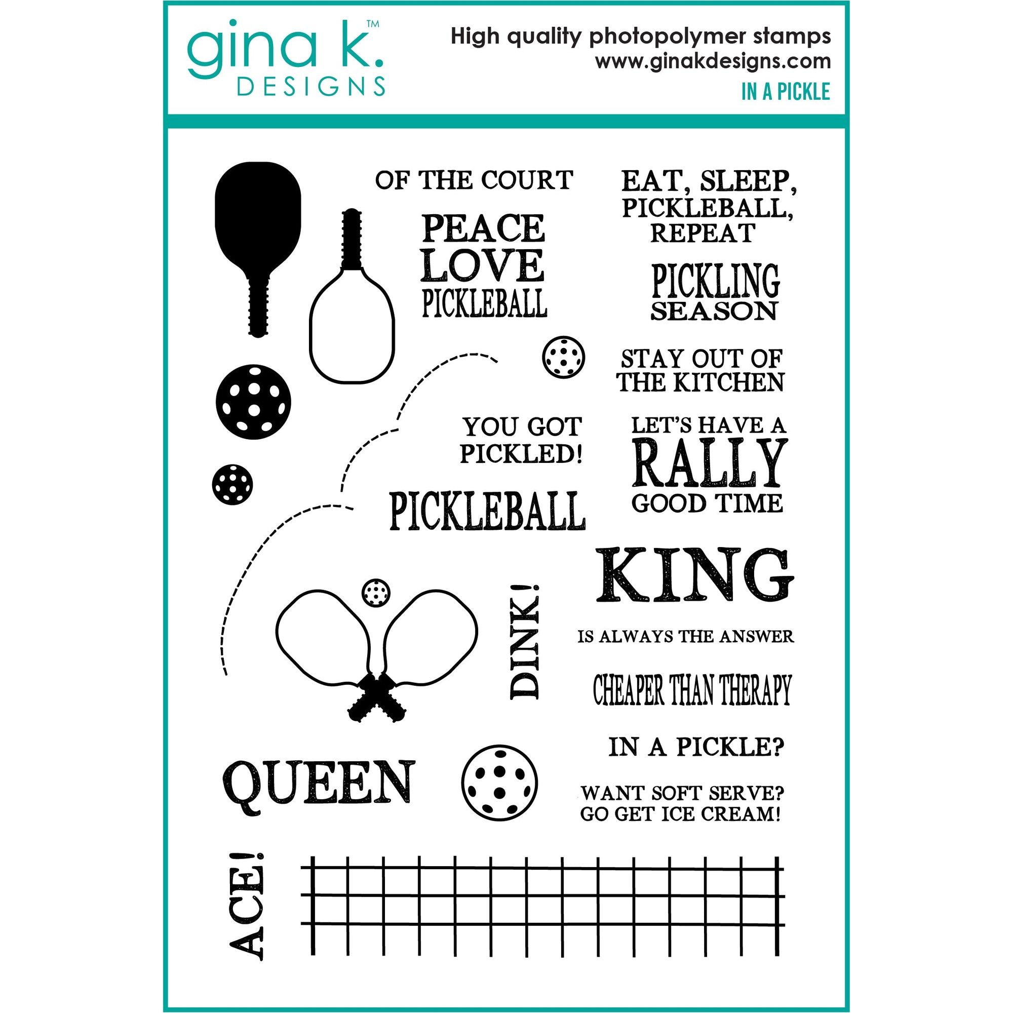 Elevate your crafting game with Gina K Designs' In A Pickle Clear Stamps. Playfully embrace the Pickleball trend with this 6x8 inch set, complete with punny sentiments, rackets, net, balls, and motion lines for an interactive design. Get ready for some creative fun! Sentiments and words included: