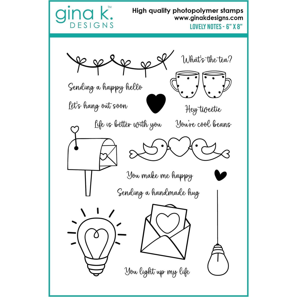 Send a love note to someone special for an occasion or just because! This 6x8 inch clear set contains 18 unique stamps including the following sentiments: What' the tea, Hey tweetie, You're cool beans, Sending a happy hello, Let's hang out soon, Life is better with you, You make me happy, Sending a handmade hug, and You light up my life.