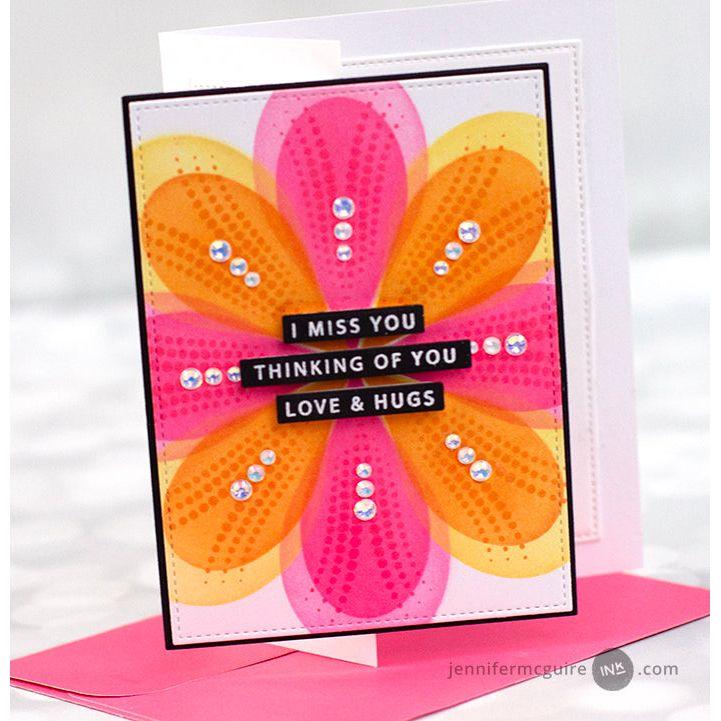 Master Layouts 2 is the second in a series of card layout templates. These dies will help you cut perfect layers for front panels for A2 cards. Approximate measurements are in inches. Rectangle Card Panel Outside Layer 4.875 x 3.625; Stitched Inside Layer 4.75 x 3.5. Oblong Rectangle Outside Layer 4.125 x 2.375; Stitched Inside Layer 4 x 2.25. Stitched Flags; Large 3.25 x 0.625; Small 2.75 x 0.5625.