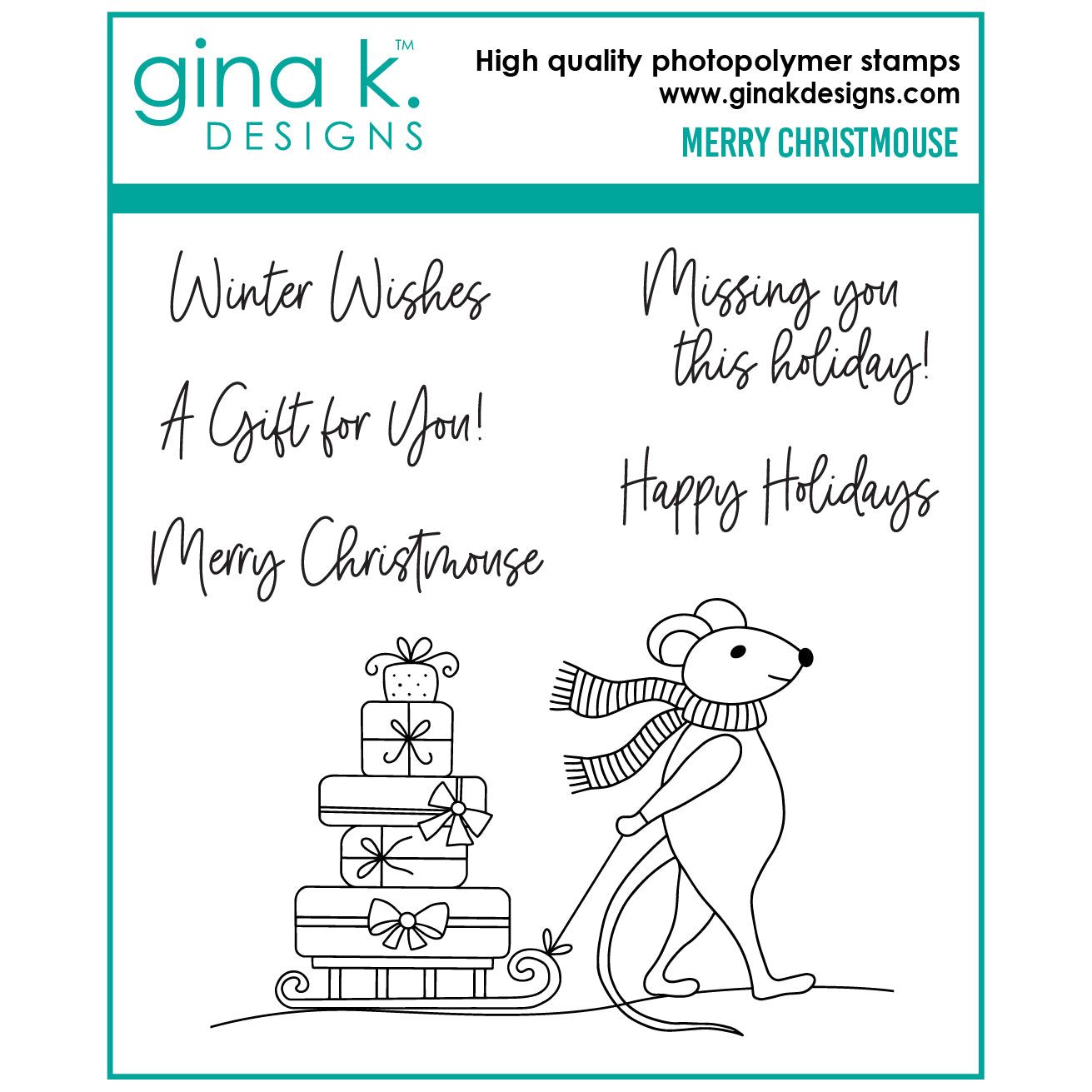 Make your Christmas greetings extra special with the Gina K Designs Merry Christmouse Stamps. This 4x4 inch stamp set showcases an adorable mouse all bundled up in a scarf, carrying a sled full of presents. Perfect for creating quick and charming holiday cards. Sentiments in a fun cursive font included: