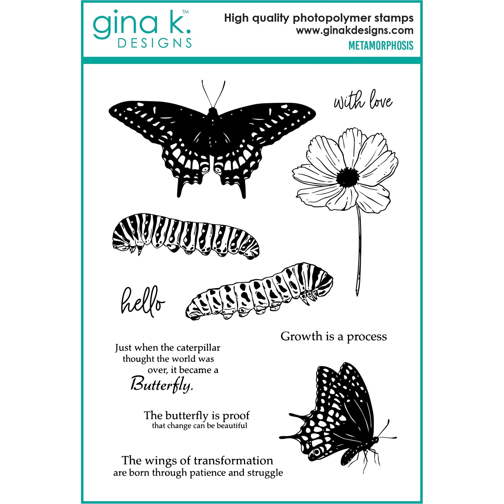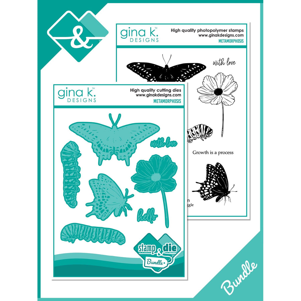 Unleash the transformative power of Gina K Designs Metamorphosis Clear Stamps and Dies Bundle. Embrace the beauty of change with a stunning butterfly in its pre- and post-metamorphosis states, along with a delicate bloom and complementary sentiments. Unlock new depths of creativity with this elegant 6x8 inch set. As a special bonus, this bundle includes the coordinating die set for perfect die cuts every time! Sentiments included: