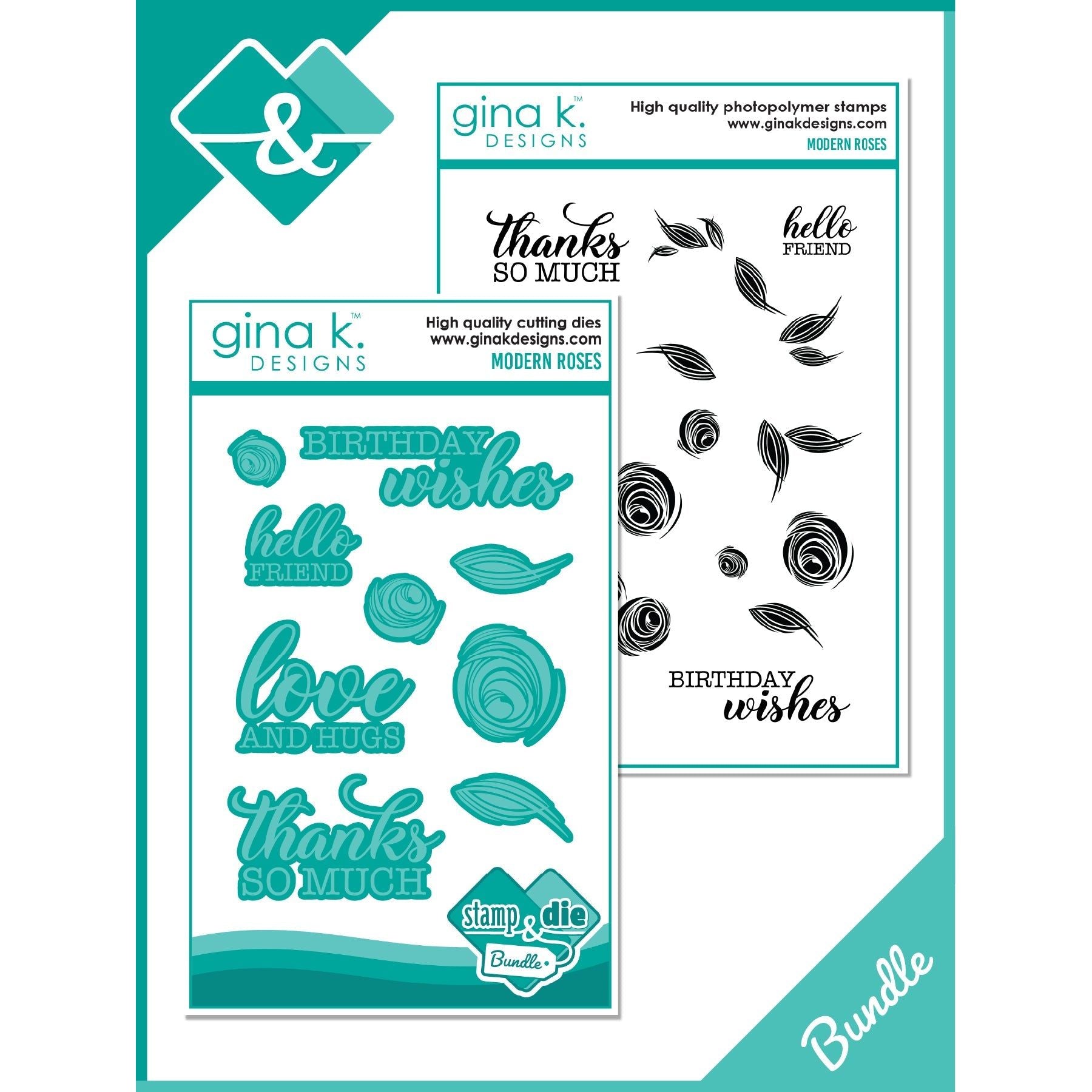 Become a floral cardmaking expert with the Gina K Designs Modern Roses Clear Stamp and Die Bundle. Elevate your creativity with 11 modern rose stamps, 11 complementary leaves, and 4 mixed font sentiments. The coordinating die set ensures perfect cuts for a professional finish. Includes sentiments: