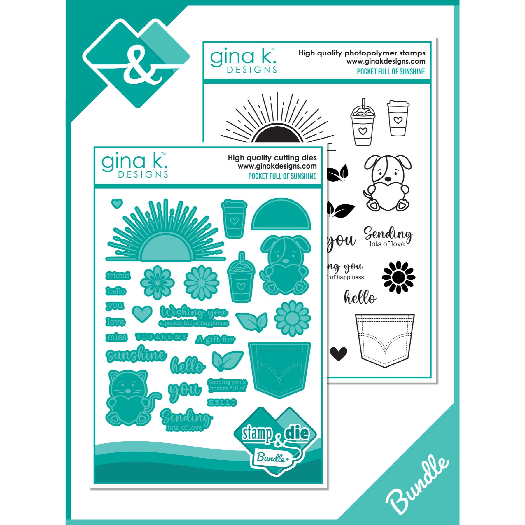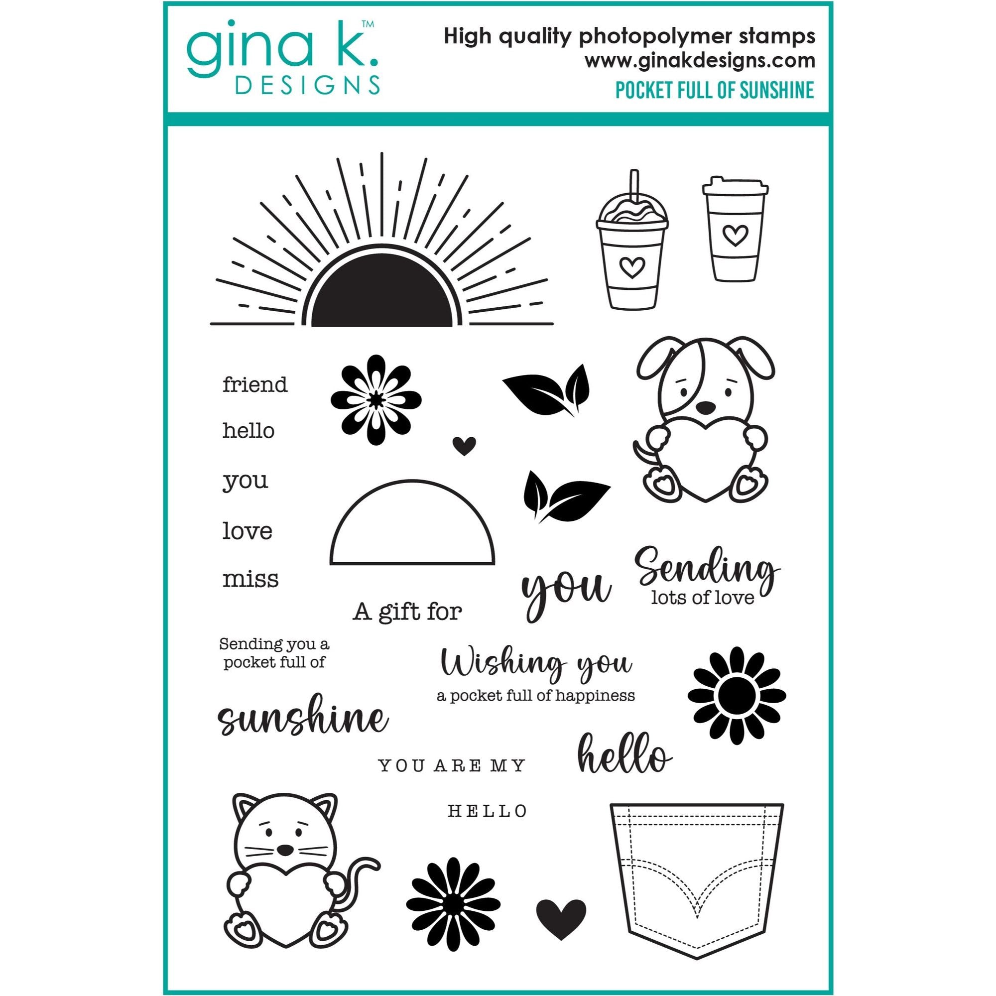 Indulge in the whimsical world of Gina K Designs with the Pocket Full of Sunshine Clear Stamp and Die Bundle. This 6x8 inch set is overflowing with charming icons like a rising (or setting) sun, adorable animals, and delightful florals. The perfect addition to your creative collection. Also including are the coordinating dies for perfect results every time! Words and sentiments included: