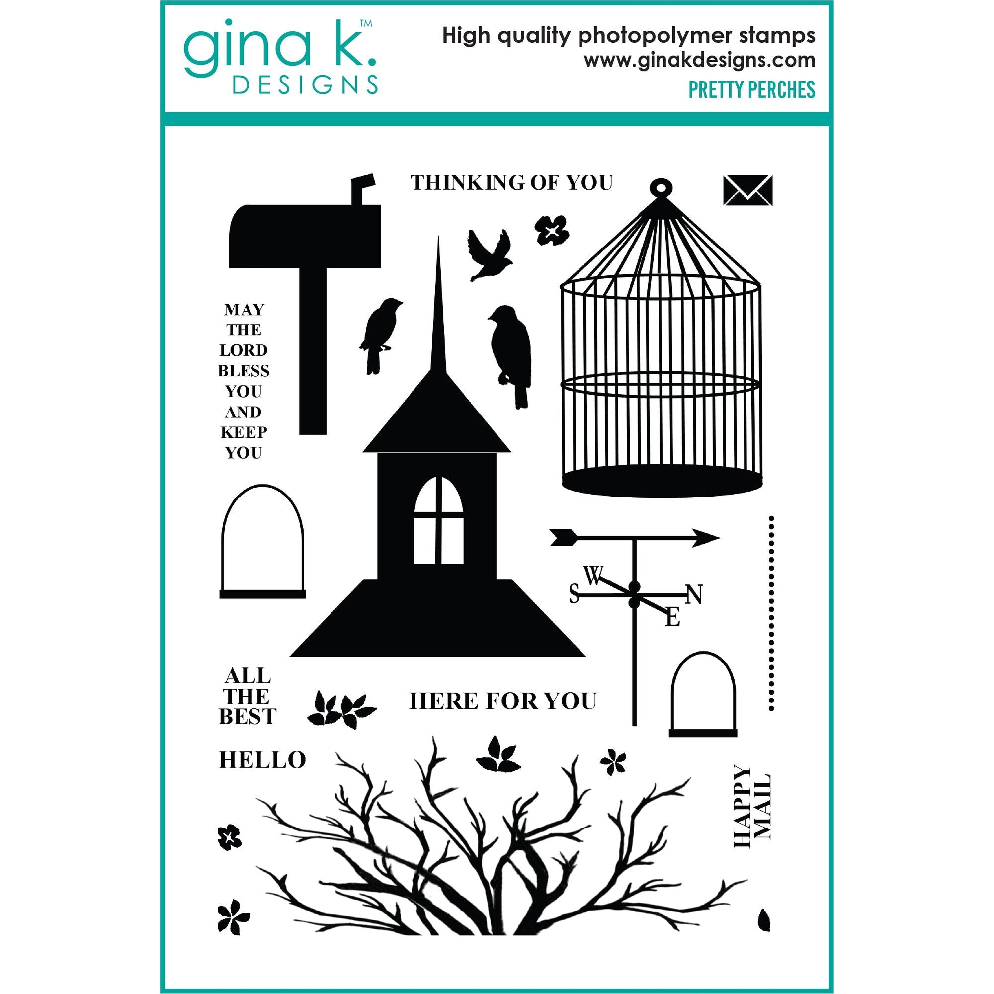 Elevate your crafting with Gina K Designs Pretty Perches Clear Stamps. Bring to life a charming birdcage, church steeple, mailbox, and more with 3 unique bird silhouettes. Add whimsical touches of nature with flowers and a weather vein all in a large 6x8 inch clear stamp set. Perfect for creating a personalized touch to any project. Sentiments included: