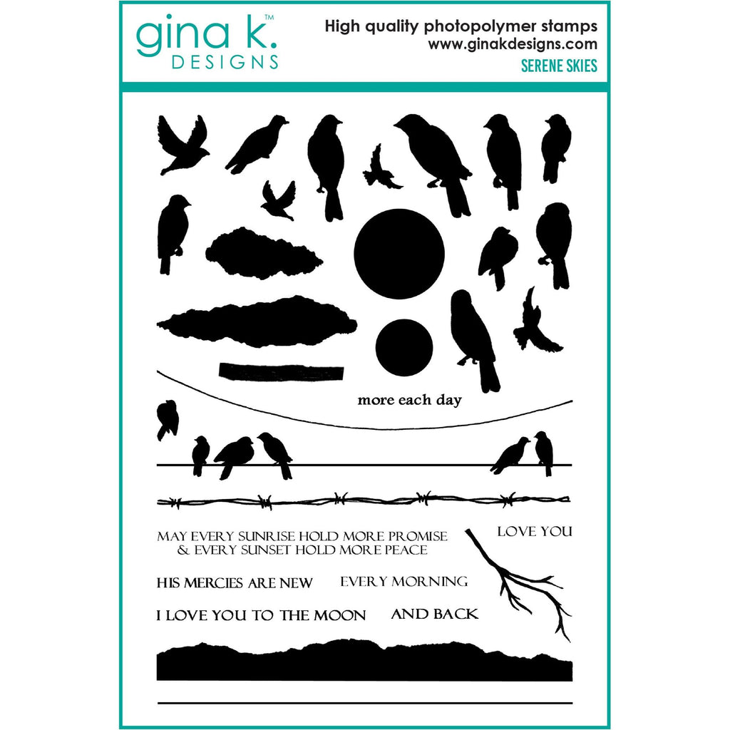 Take your stamping game to new heights with Gina K Designs Serene Skies Clear Stamps! This 33-piece set is perfect for bird lovers and those who appreciate simple, stunning silhouette scenes. Create unique designs with a variety of bird stamps, wires for perching, and grounding elements like the moon and sun. Fly high with these gorgeous stamps! Sentiments included: