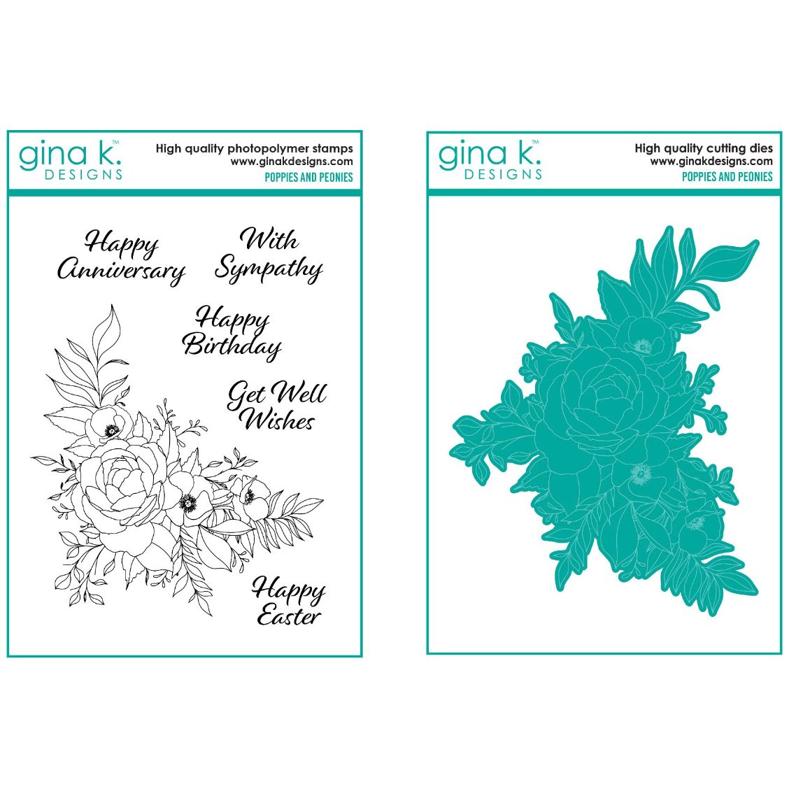 Effortlessly create stunning floral arrangements with the Gina K Designs Poppies and Peonies Clear Stamps and Die set. This set includes a large bouquet image with crisp poppies and a beautiful peony flower, plus greenery and 5 elegant sentiments. Simplify your crafting and elevate your projects with this versatile stamp set. Stamp set is approximately 6x8 inches. This set also includes the large floral bouquet coordinating die for perfect cuts every time! Sentiments included: