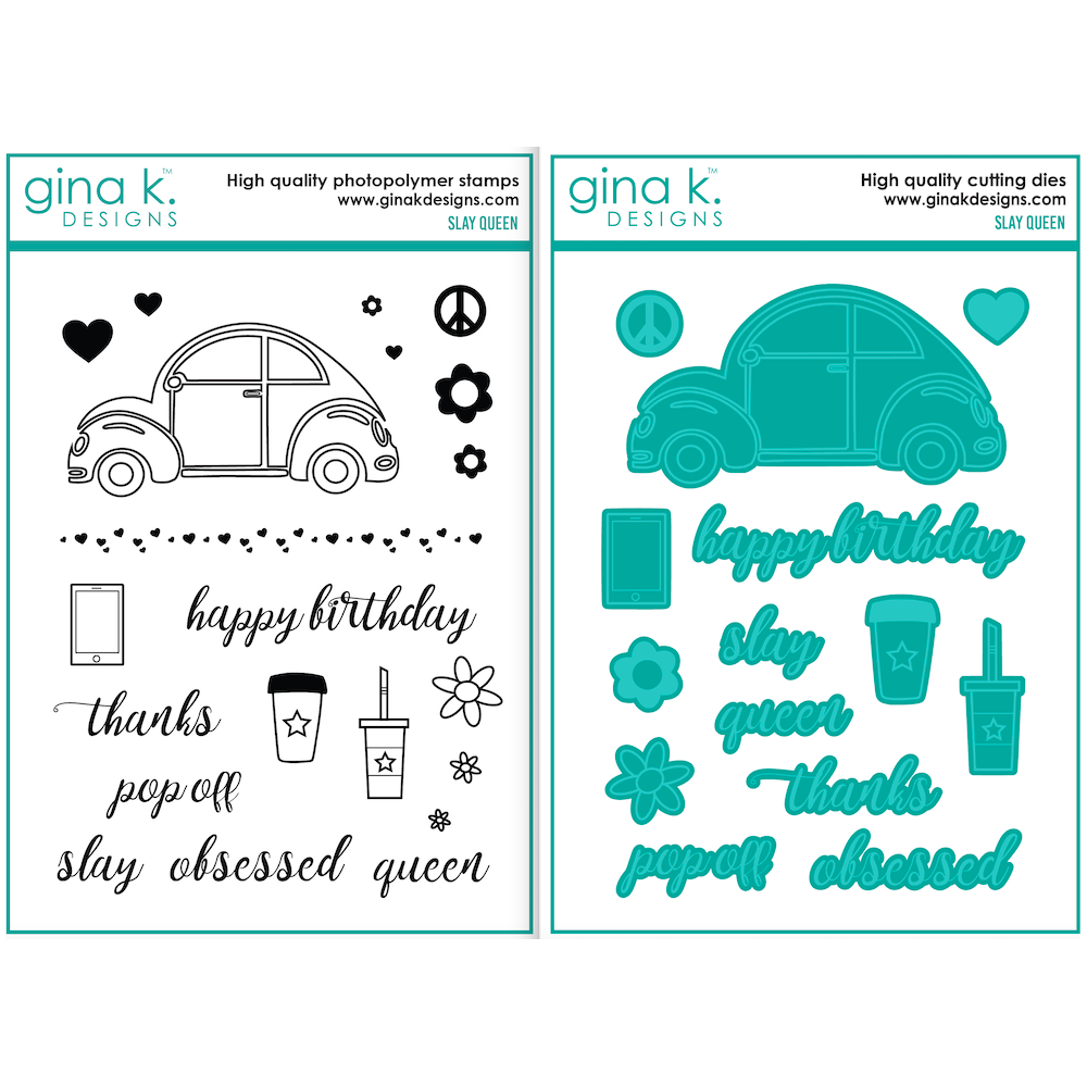 Add some groovy vibes to your cards and crafts with the Gina K Designs Slay Queen Clear Stamps. This 21-piece set includes a Beetle car, hearts, flowers, peace sign, and more for a perfect mix of retro and modern. Perfect for Galentine's Day, Thank you's, and Birthdays, with sentiments to complete the scene. Also includes coordinating dies for every stamp included in the set for perfectly cut dies every time! Words or sentiments included: