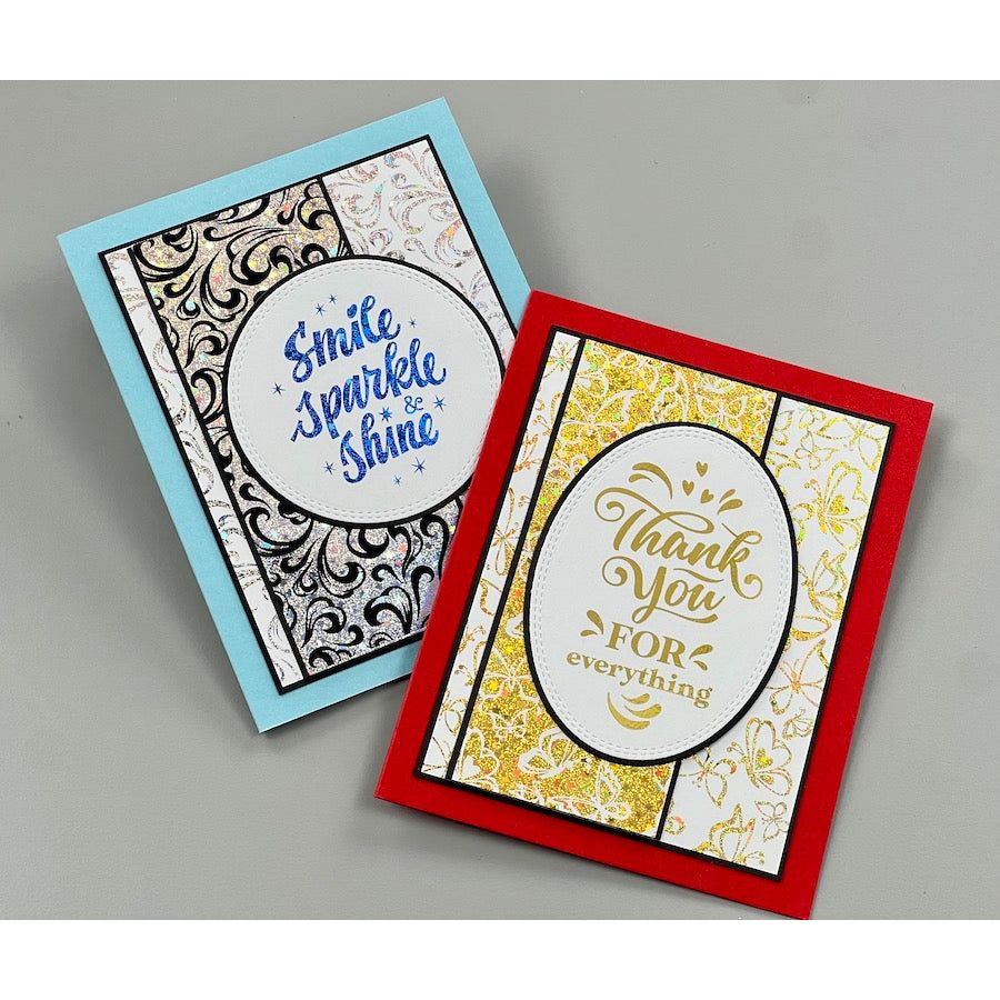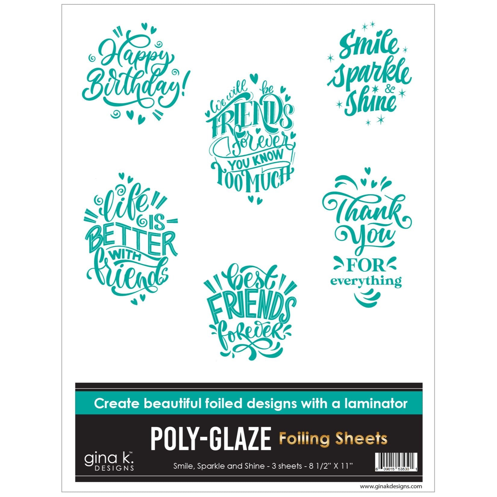 Elevate your paper crafting projects with Gina K Designs Smile, Sparkle, and Shine Poly-Glaze Foiling Sheets. The Poly-Glaze coating ensures smooth application of Deco-foil without any black spots or dropouts. No expensive equipment necessary, just use your household laminator for stunning results. set of 3 sheets in one pattern. Each are 8.25 x 11 inches.