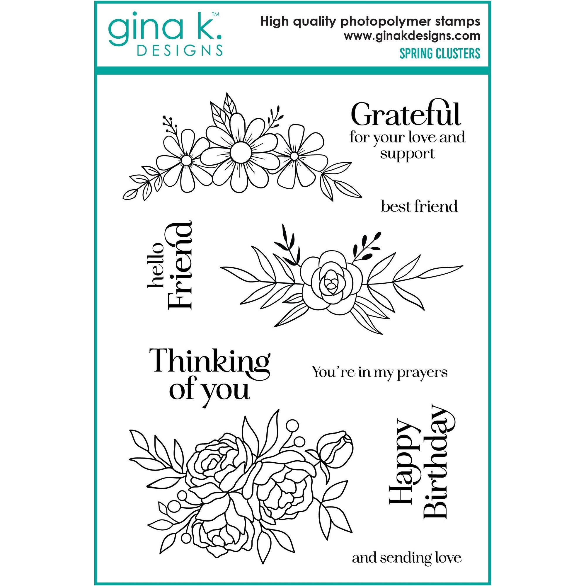 Create stunning cards quickly with the Gina K Designs Spring Clusters Stamps. This 10-piece 6x8 inch clear stamp set includes 3 exquisite floral arrangements and 7 complementary sentiments to effortlessly complete your design. With its size of 6x8 inches, this clear stamp set is perfect for creating beautiful scenes in no time. Sentiments include: