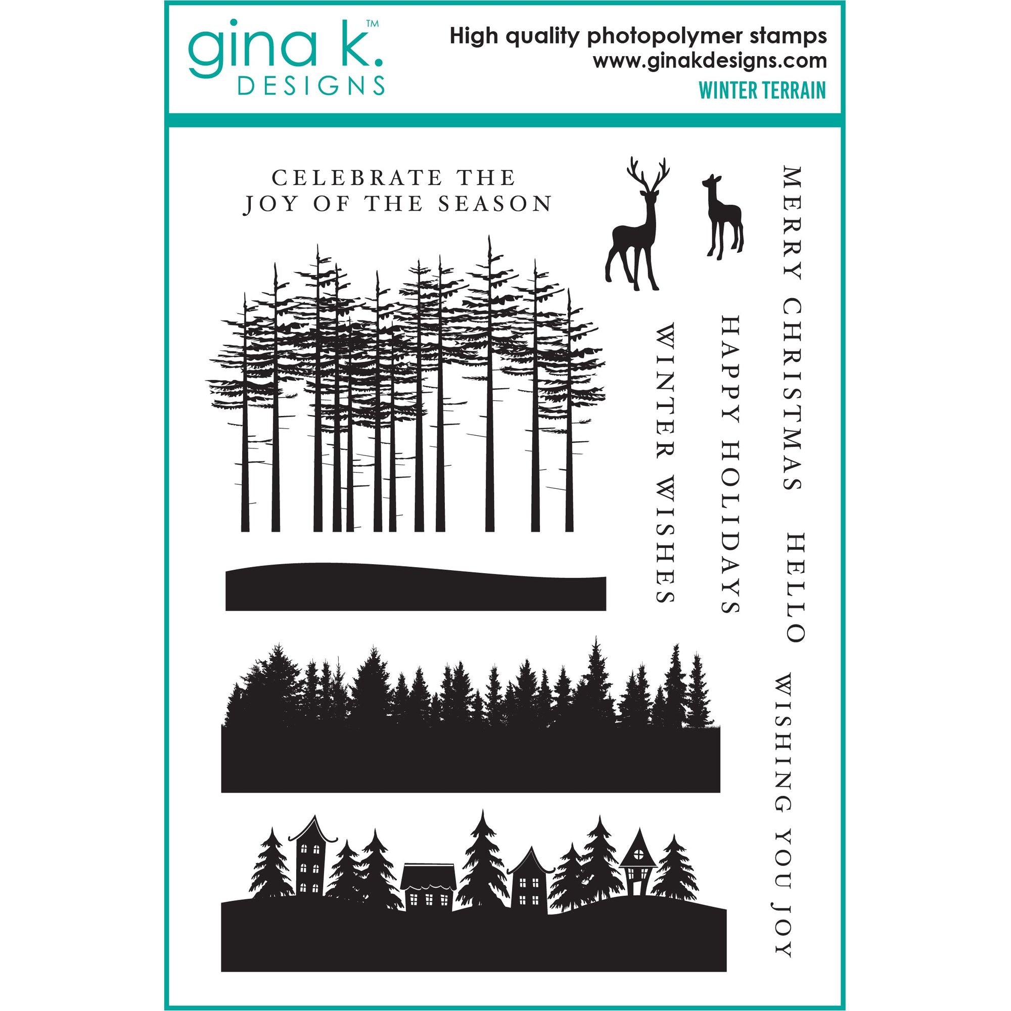 Gina K Designs Winter Terrain Clear Stamps are perfect for crafting beautiful, serene holiday cards. This set of 12 clear stamps includes two unique deer, two varieties of evergreen background options, a snow bank hill, and a village accented with evergreen trees. Create a tranquil winter wonderland with these 6x8 inch stamps. Sentiments included: