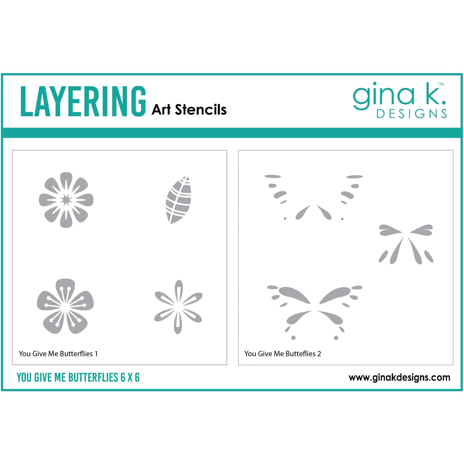 Add beautiful floral flourishes and butterflies to your artwork with the Gina K Designs You Give Me Butterflies Layering Stencils. This set of two 6x6 inch stencils helps you create intricate layered designs with ease – simply align the two templates for accurate placement and create a stunning design in minutes! Coordinates perfectly with Gina K Designs You Give Me Butterflies clear stamps and stencils!