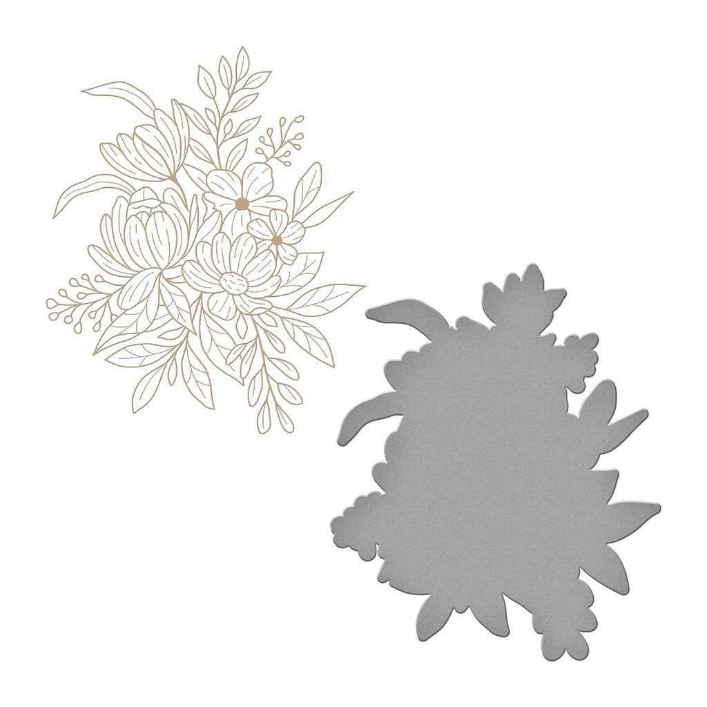 The coordinating die in the set cuts the entire silhouette of the floral bouquet, adding dimension and interest to your creations.
