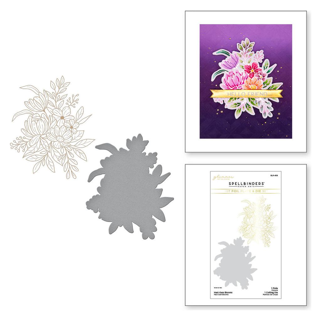Introducing the Hexi-Gem Blooms Glimmer Hot Foil Plate and Die Set from the Hexi-Gems Collection by Spellbinders. This set includes a stunning floral bouquet design in the form of a hot foil plate, along with a coordinating die that cuts the entire silhouette of the bouquet.