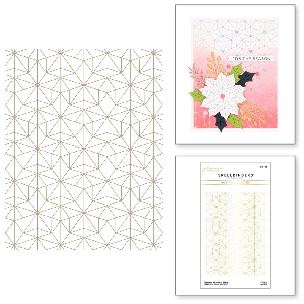 The Glimmer Monoline Stars Hot Foil Plate is a notable component of the Spellbinders Glimmer for the Holidays Collection. As part of this collection, the Glimmer Monoline Stars Hot Foil Plate showcases a striking geometric star design that holds the potential to create an exceptional background for various projects. This particular hot foil plate is designed to cover the entirety of an A2 size card front with its dazzling star pattern, providing a seamless and visually impactful backdrop.